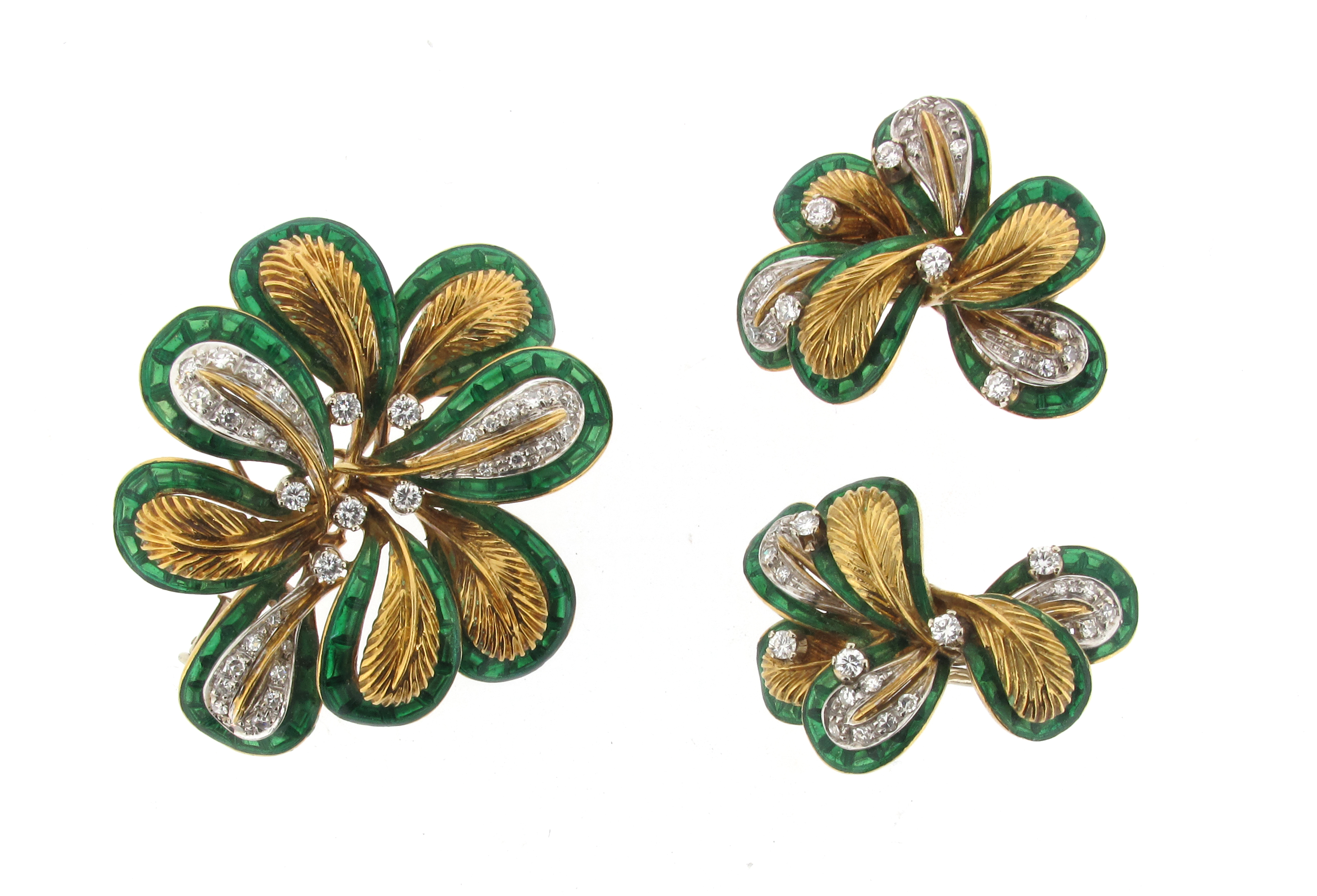 A gold floral brooch with matching earrings, all designed as abstract flower heads in yellow and white gold, set with diamonds and with green enamel border decoration, 39g total