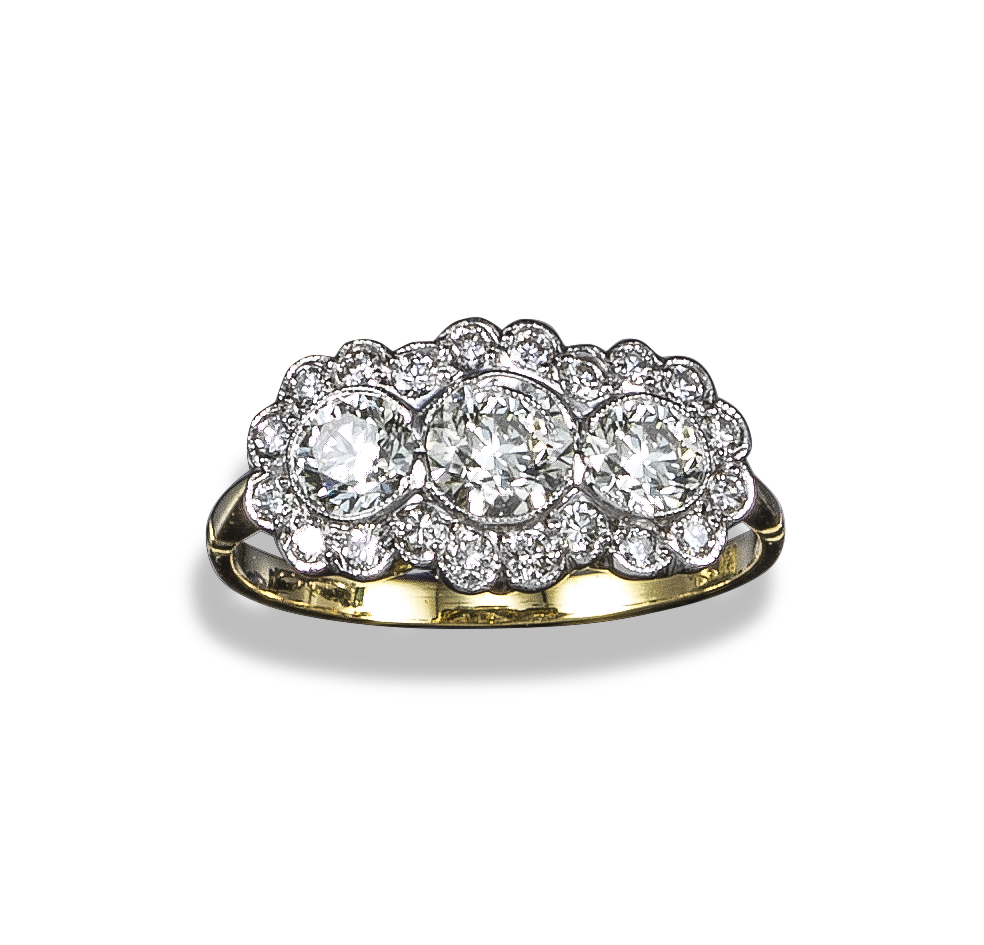 A diamond cluster ring, the three centre graduated round brilliant-cut diamonds are millegrain-set within a surround of small circular-cut diamonds in yellow and white gold, size M