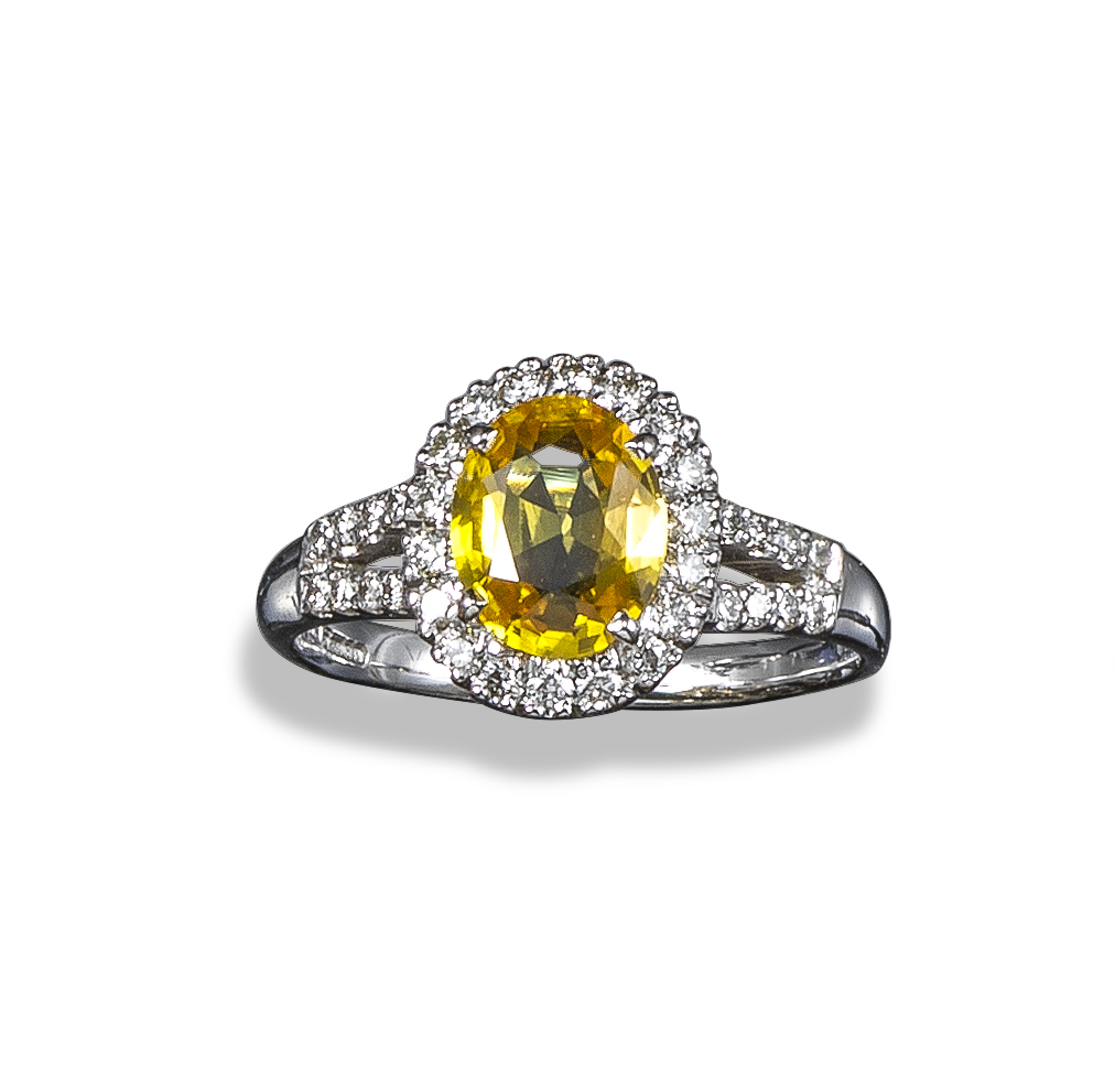 A yellow sapphire and diamond cluster ring, the oval-shaped sapphire set within a surround of round brilliant-cut diamonds in white gold, with further round brilliant-cut set to the bifurcated shoulders, size M
