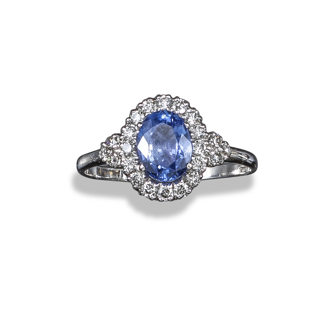 A sapphire and diamond cluster ring, the oval-shaped sapphire set within a surround of round brilliant-cut diamonds in white gold, with trefoils of diamonds set to the shoulders, with maker's mark and London hallmarks for 2015, size M ½