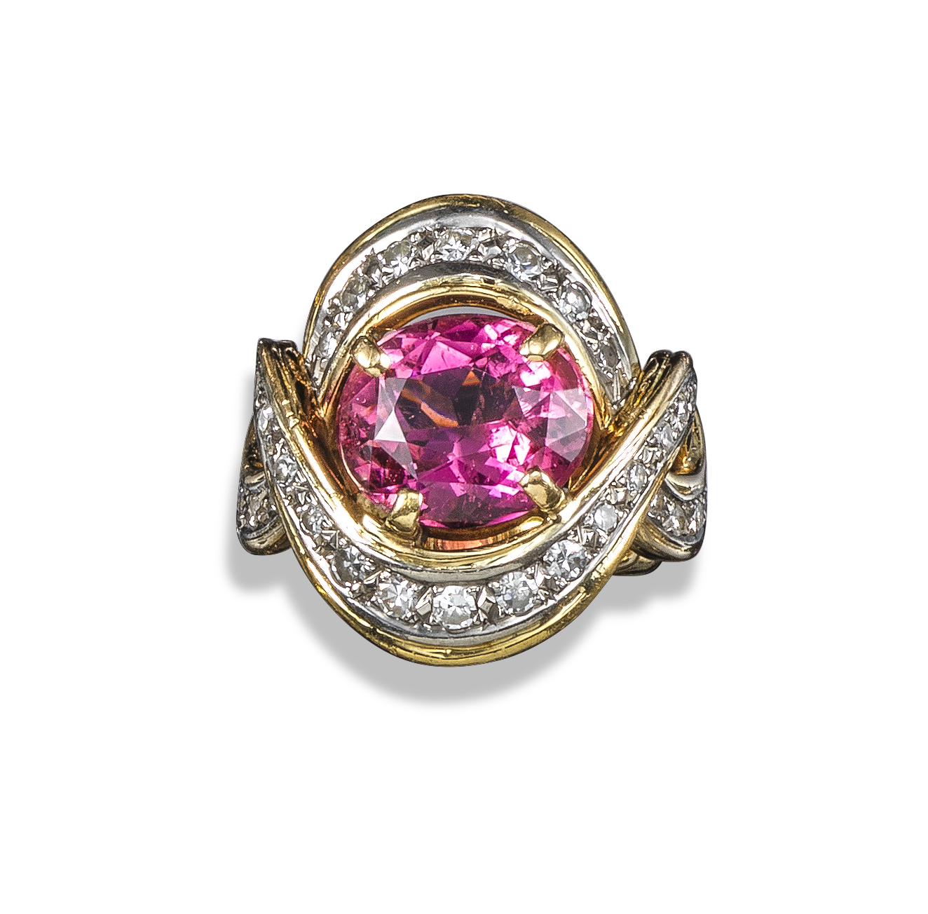 A 18ct white gold, pink tourmaline and diamond cluster ring, 1950s, the oval-shaped rubelite is claw-set within a surround of single-cut diamonds in an intertwined yellow mount, with further circular-cut diamonds set to the shoulders, size I 1/2