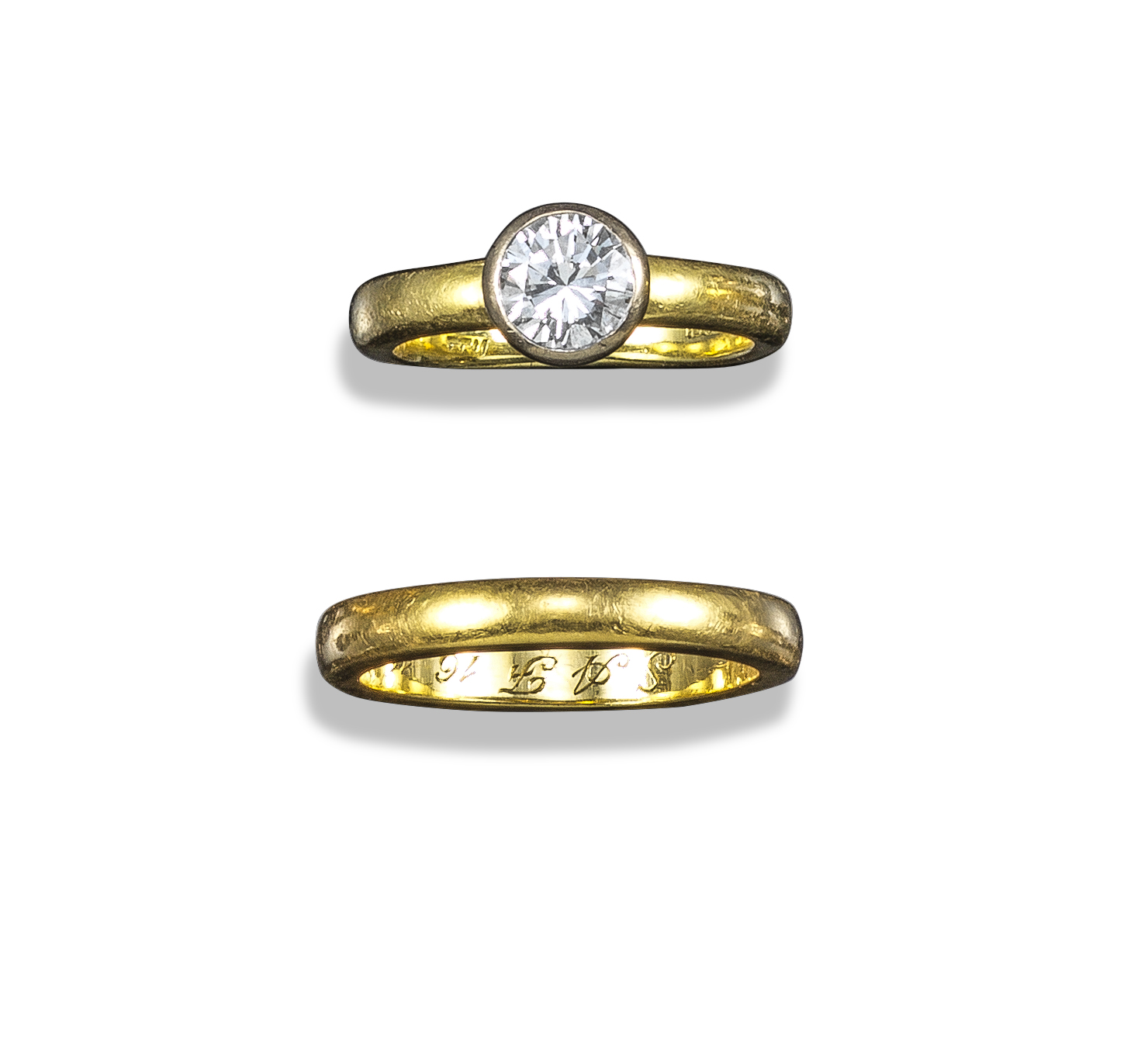 A diamond solitaire ring and wedding band, the round brilliant-cut diamond weighs approximately 0.60cts and is rubover-set in yellow gold, on plain 18ct yellow gold band, with London hallmarks for 1995, size G 1/2, together with an 18ct yellow gold wedding band, inscribed 'SAF 16.11.96 LJM', with maker's mark B&N and London hallmarks for 1996, size L