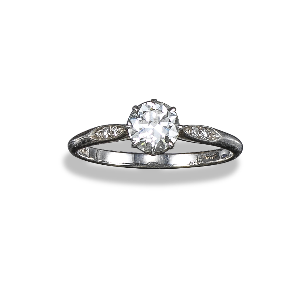 A diamond solitaire ring, the round brilliant-cut diamond weighs approximately 0.60cts, with two small circular-cut diamonds to each shoulder in platinum, size K 1/2