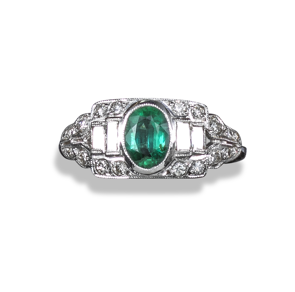 An emerald and diamond cluster ring, the centre oval-shaped emerald weighs approximately 0.50cts and is rub-over set within a surround of four baguette-cut shoulder diamonds and further round brilliant-cut diamonds in white gold, size N 1/2