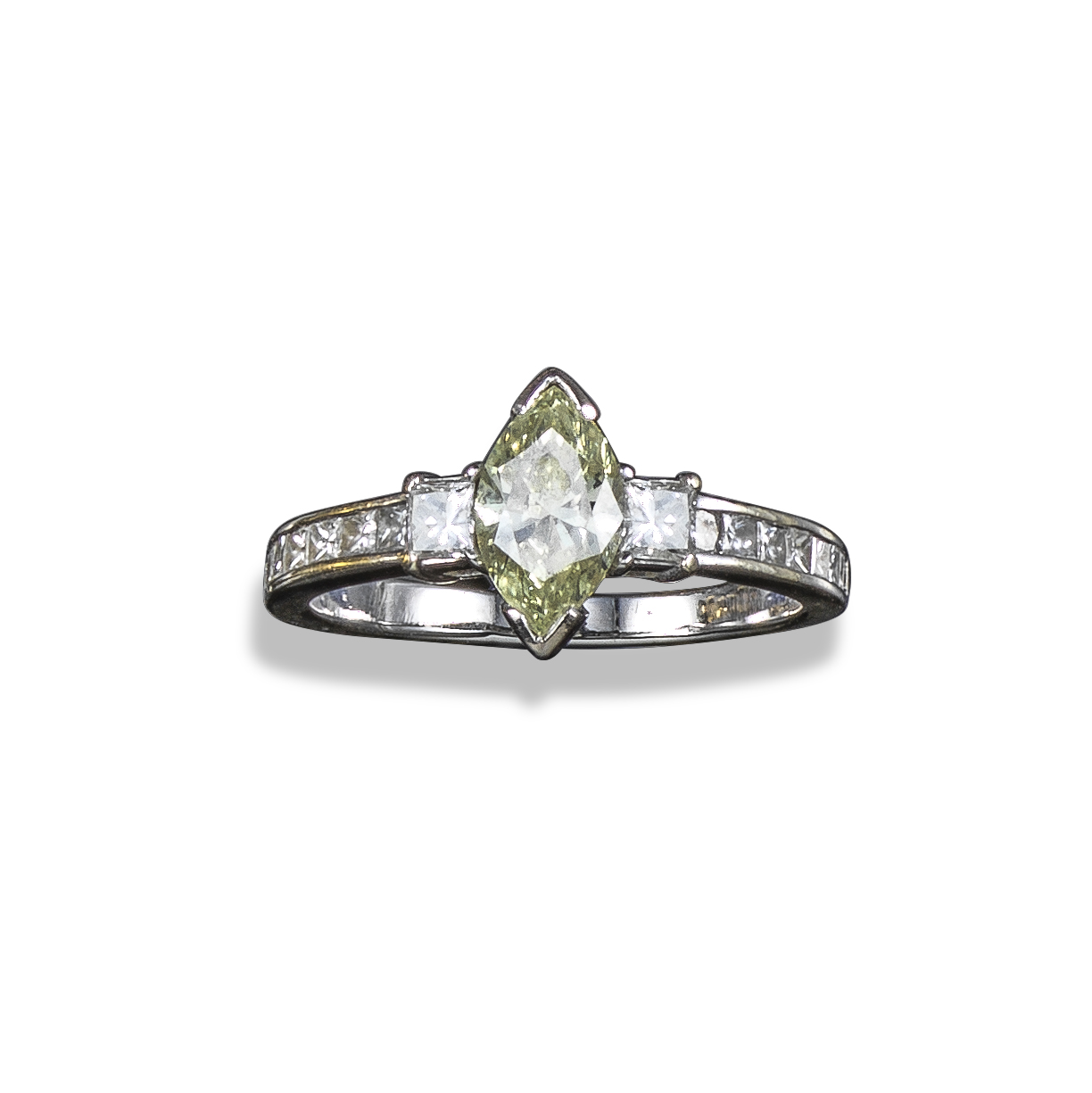 Accompanied by report number 5777-8395 dated 23 Janaury 2017 from GCS, London stating that the marquise-shaped diamond weighs 1.00cts and is a natural diamond with fancy-light greenish-yellow and VS1 clarity
