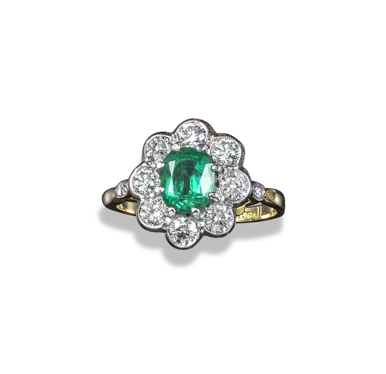 An emerald and diamond cluster ring, the oval-shaped emerald weighs approximately 1.10cts and is set within a surround of eight round brilliant-cut diamonds in yellow and white gold, with two further smaller round brilliant-cut diamonds to each shoulder, size O
