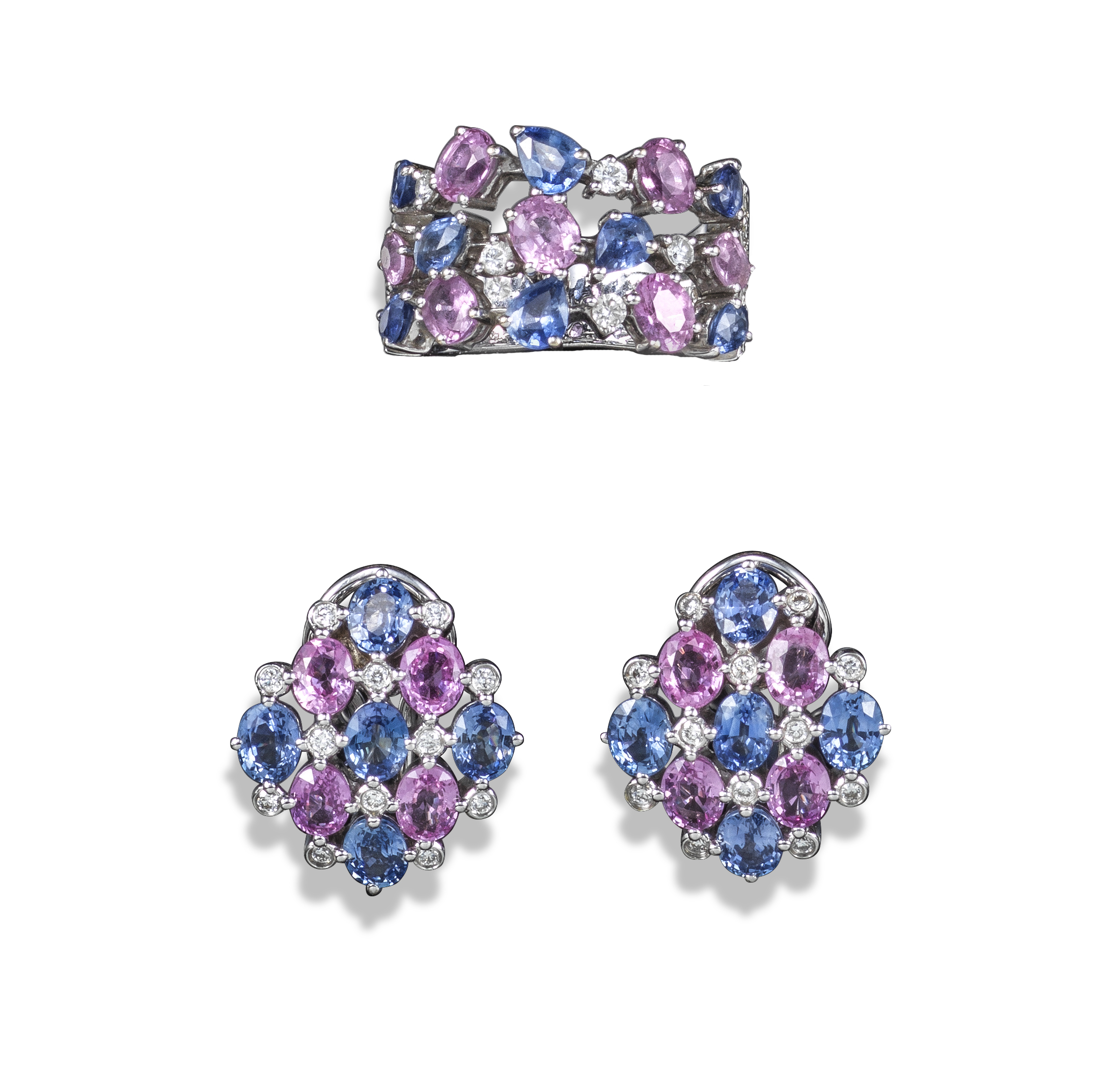 A sapphire and diamond ring and earring suite, the openwork ring set with oval-shaped pink sapphires, pear-shaped blue sapphires and round brilliant-cut diamonds, with further circular-cut diamonds to the shoulders in white gold, the openwork earrings set with oval-shaped pink and blue sapphires and rubover-set circular cut diamonds in white gold, with post and clip fittings, all with maker's mark IF and with London hallmarks for 2004, ring size N, earrings 2cm high