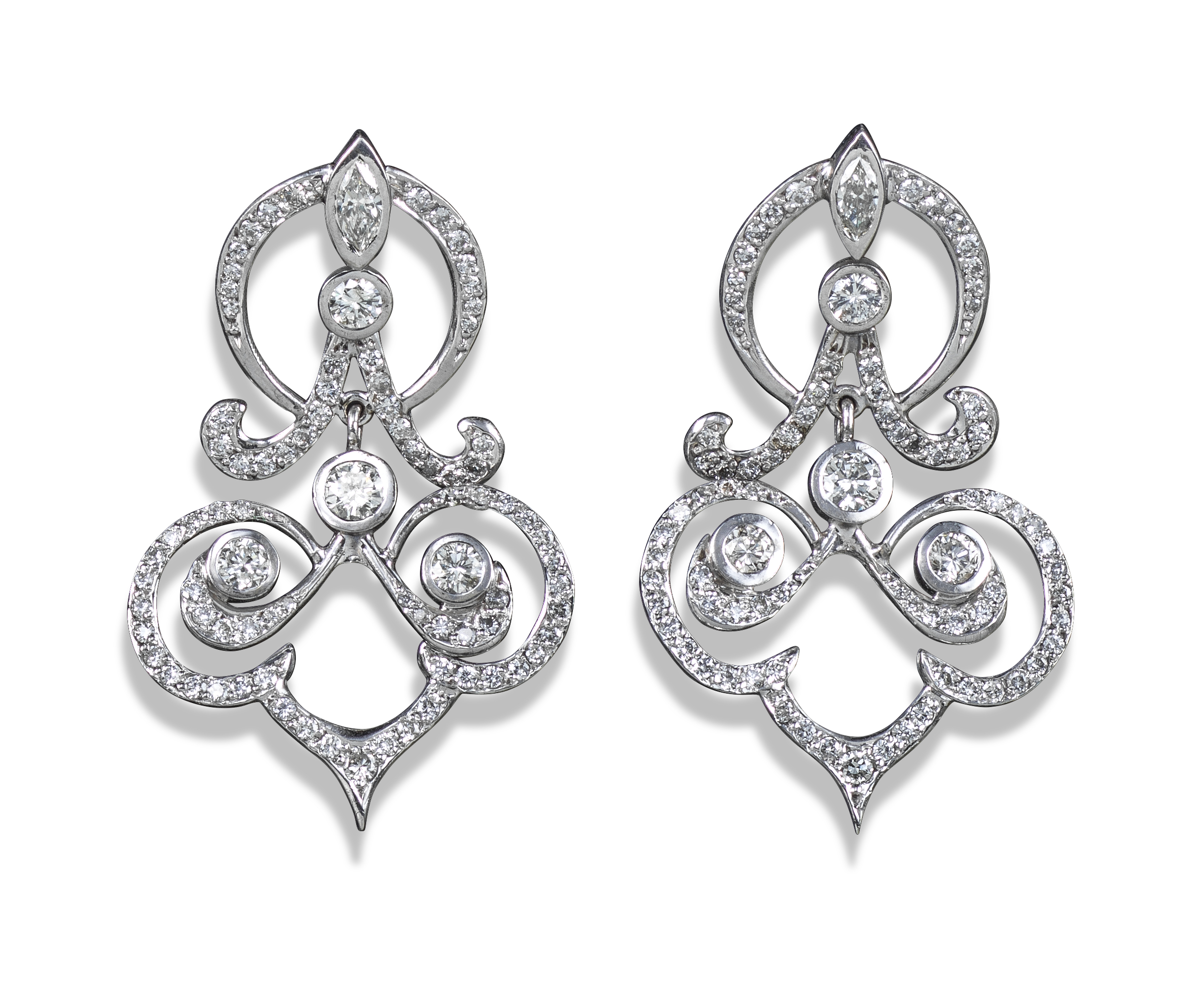 A pair of diamond scroll-form drop earrings, each open-work top section set with a marquise-shaped and larger round brilliant-cut diamond with a circular diamond-set frame, suspending a scrolling drop section rubover-set with three larger round brilliant-cut diamonds and further smaller graduated round brilliant-cut diamonds to the scroll frame, all in white gold, post fittings, 4.8cm high