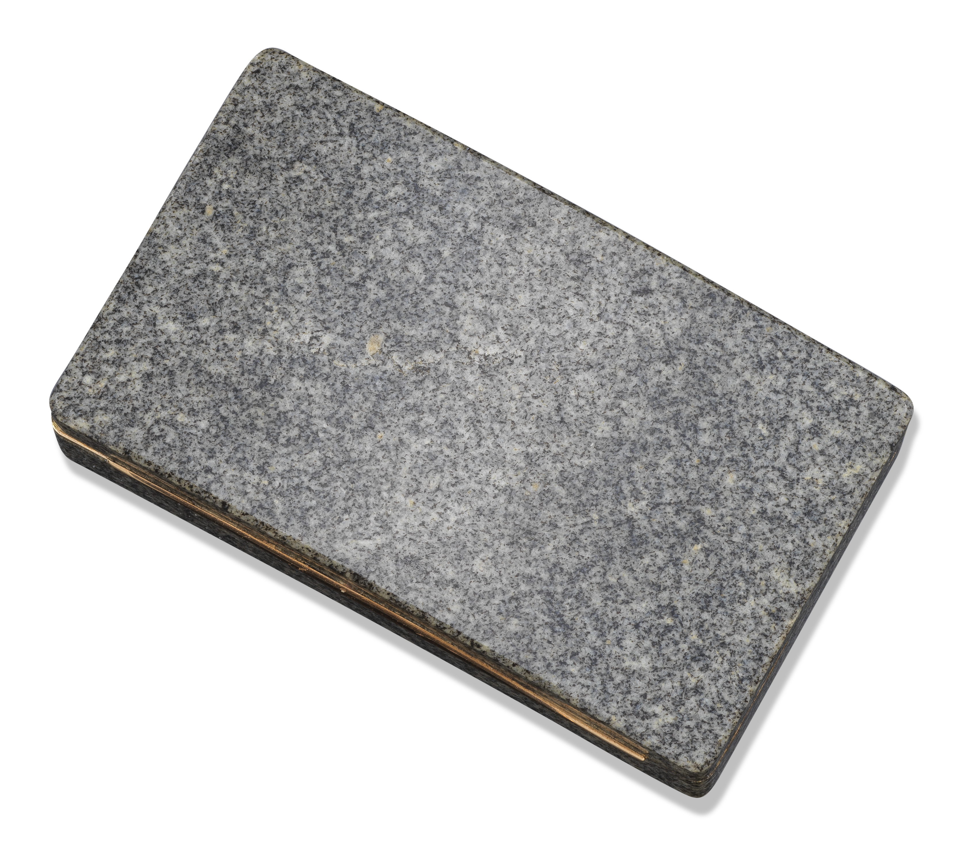 An early 19th century rectangular hardstone snuffbox, gold mounts and of convex form, obscure marks but possibly Austrian, 8.5cm long