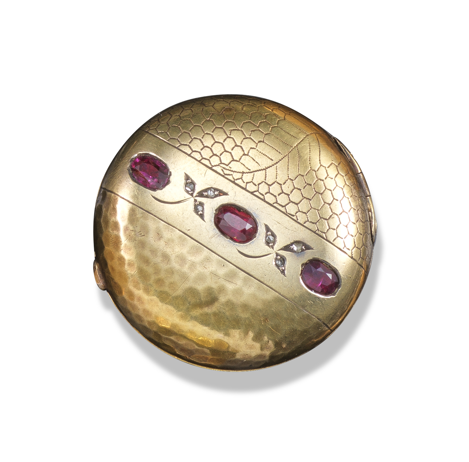 A circular waisted gold box with hinged cover, the cover with hammered and engraved decoration and set with three rubies and rose-cut diamond-set leaves, 3cm wide