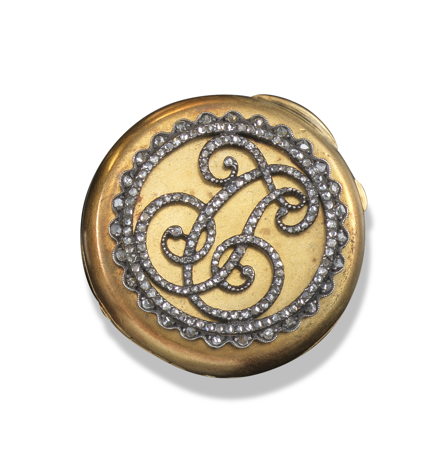 A small circular gold box, the hinged cover applied with rose-cut diamond-set initials JC within a border of rose-cut diamonds, 3cm wide