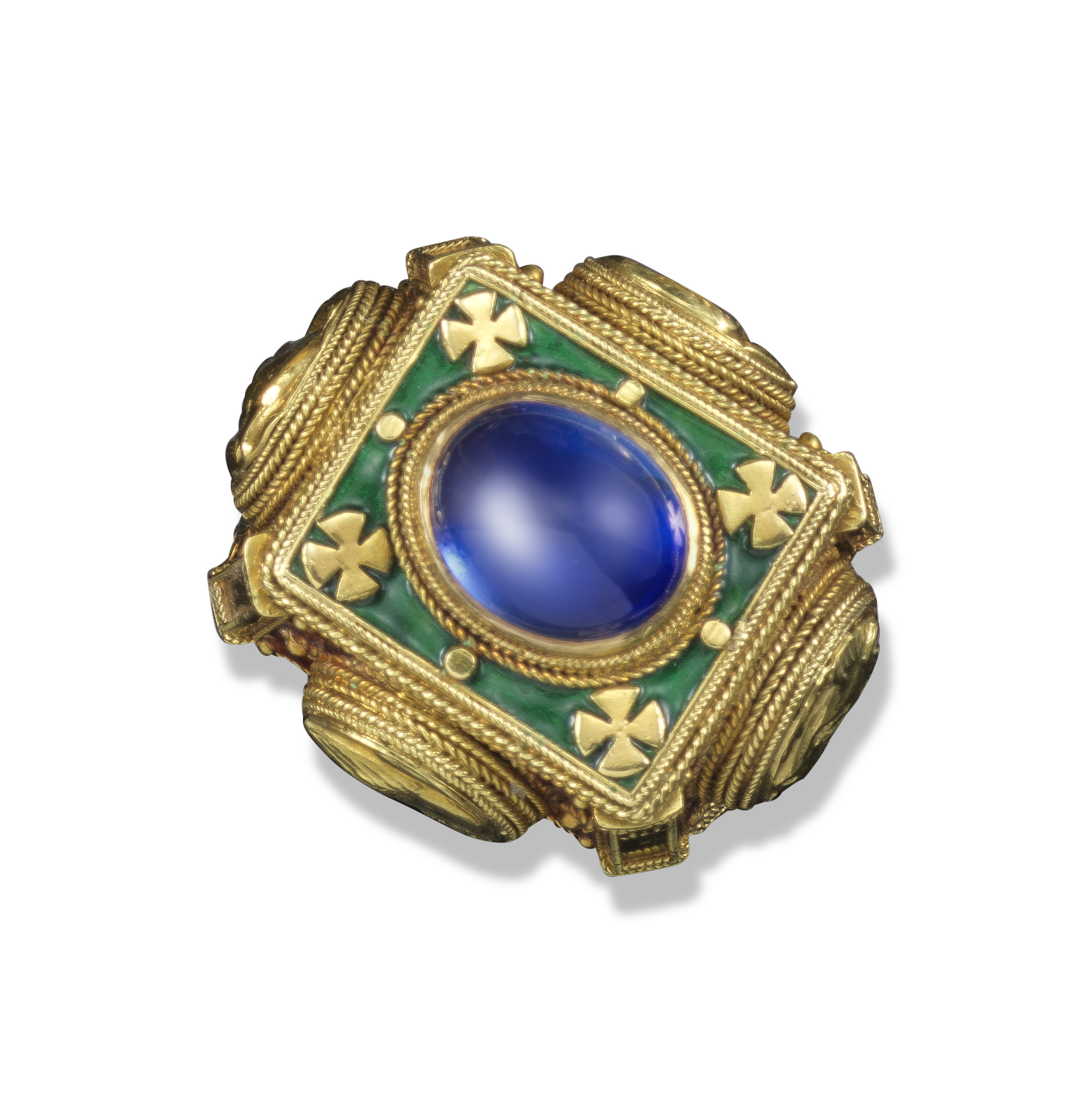 An impressive gold, enamel and synthetic sapphire-mounted ring, previously the property of Bishop Halford, of tapered square form and set with an oval-shaped cabochon synthetic sapphire on green enamel ground and quartered with a cruciform motif, the sides applied with a Lion, Eagle, Angel and Bull for the Evangelists, Mark, John, Matthew and Luke, each on red enamel ground and separated with a column, plain shank and decorated with fine wire work, 3cm wide, size S