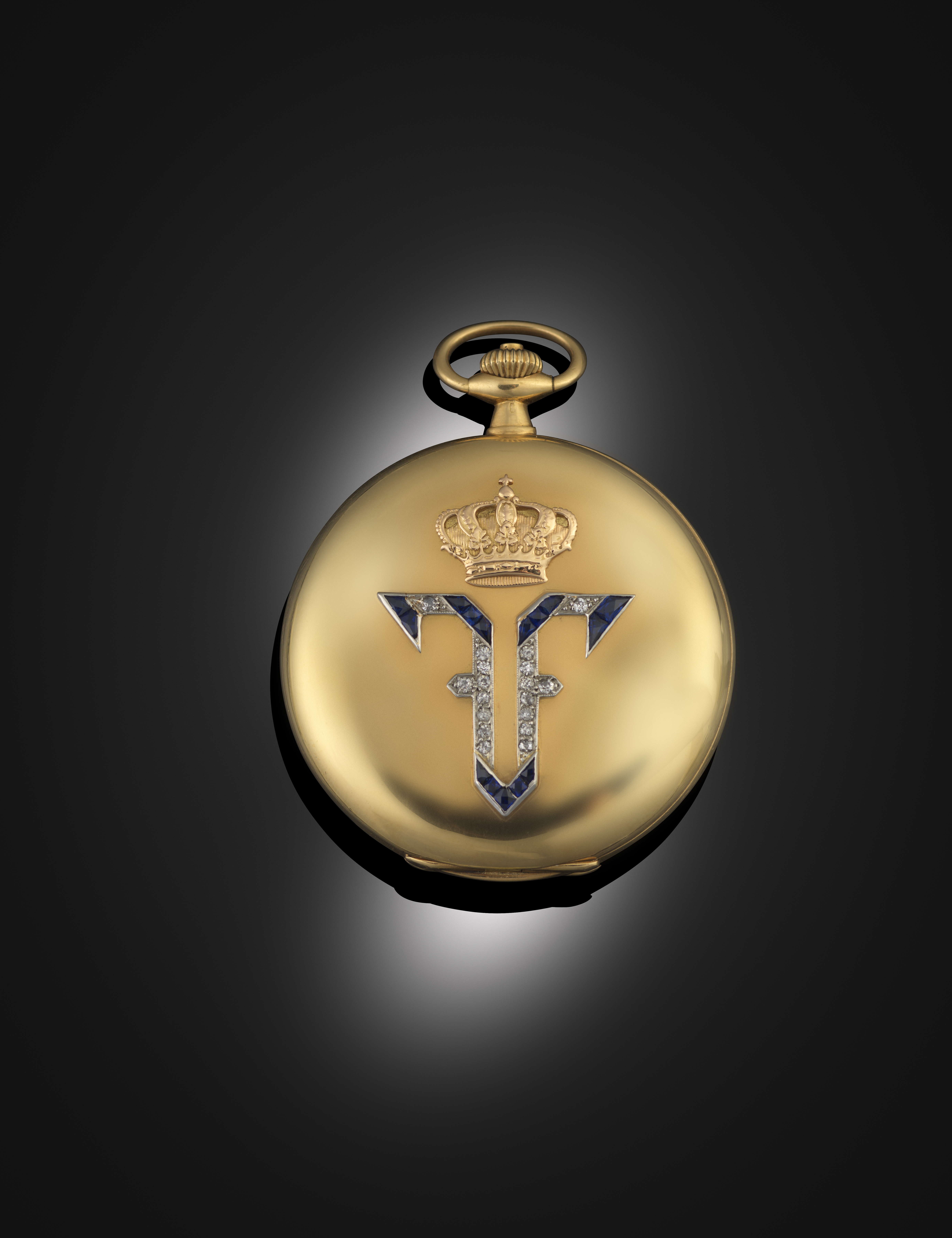 An 18ct gold hunter pocket watch by Longines, with lever escapement, the gold case with the crest and monogram of King Farouk, the initials set with calibré-cut sapphires and circular-cut diamonds in platinum, the signed circular dial with black Roman numerals, subsidiary seconds dial, the movement signed and numbered 2529803, 5cm wide, leather pouch