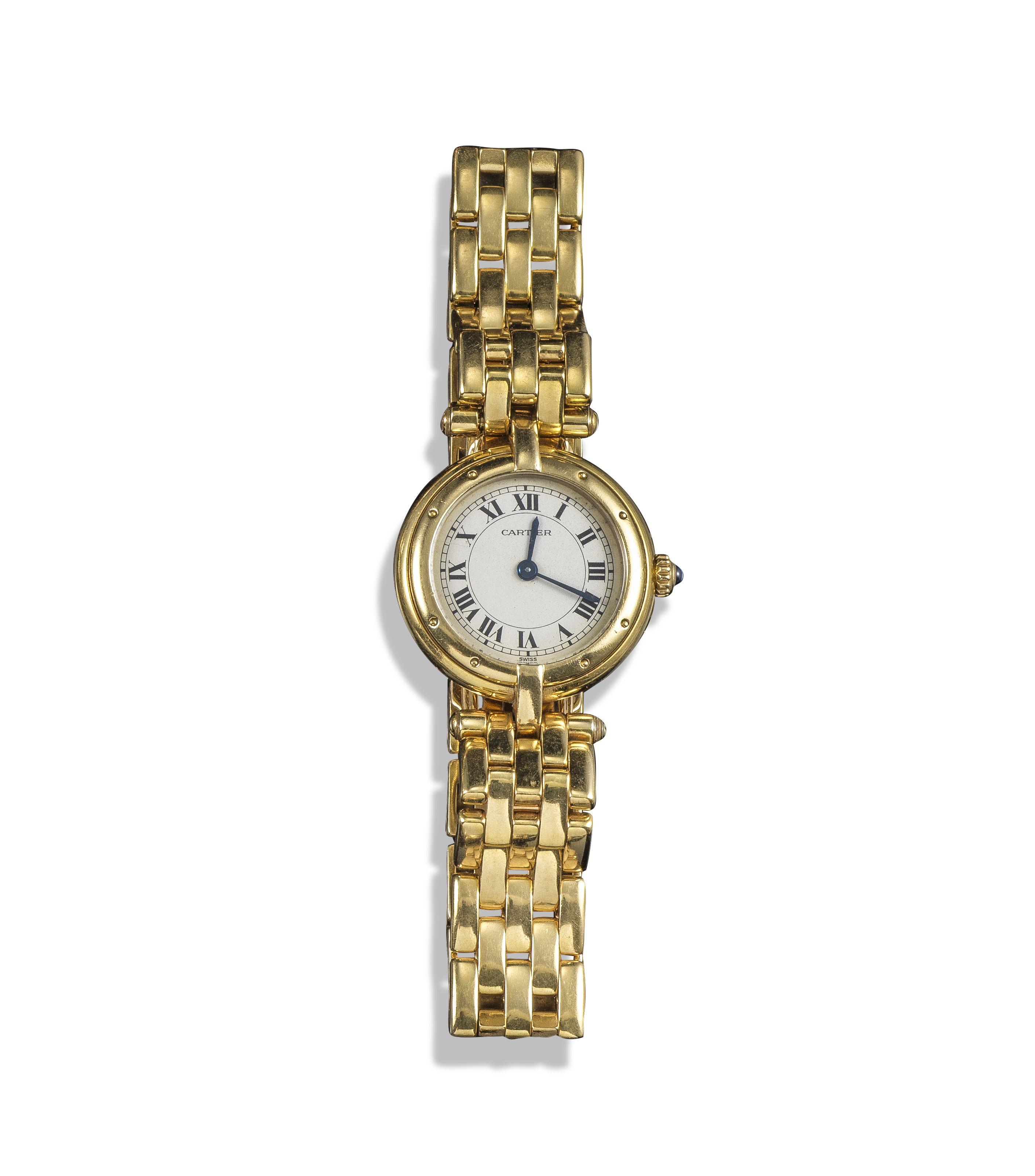 CARTIER - A round Panthere lady's yellow gold wrist watch, the round signed dial with black Roman numerals, sapphire winder and quartz movement, numbered and 669201424, yellow gold gate-link bracelet with yellow gold Cartier deployant clasp, 24cm long