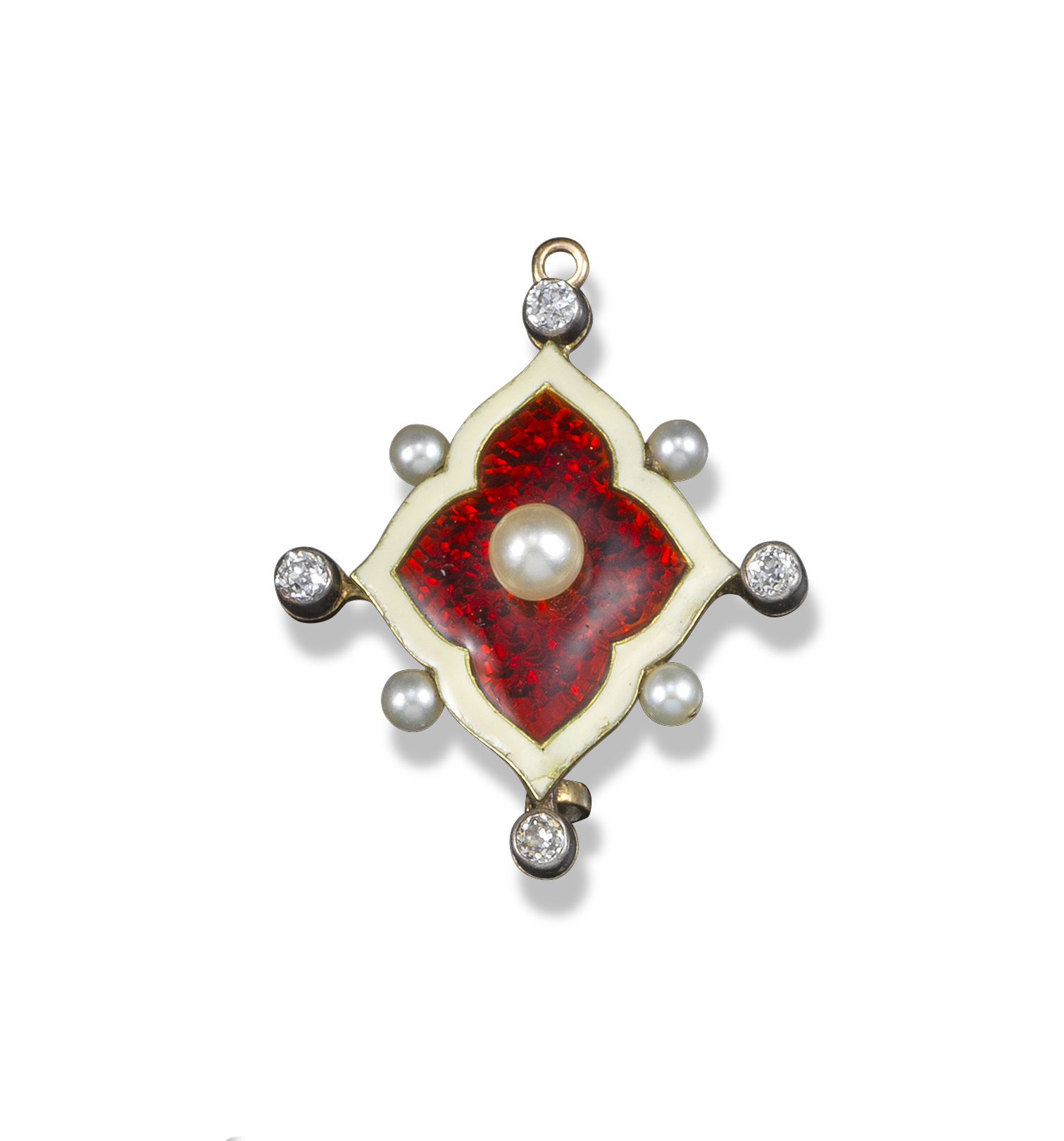 An Edwardian enamel pearl and diamond brooch pendant, the lozenge-shaped centre section decorated with a central pearl within red guilloche enamel and white enamel border, alternately decorated with a border of diamonds and pearls in silver and gold, 3cm long
