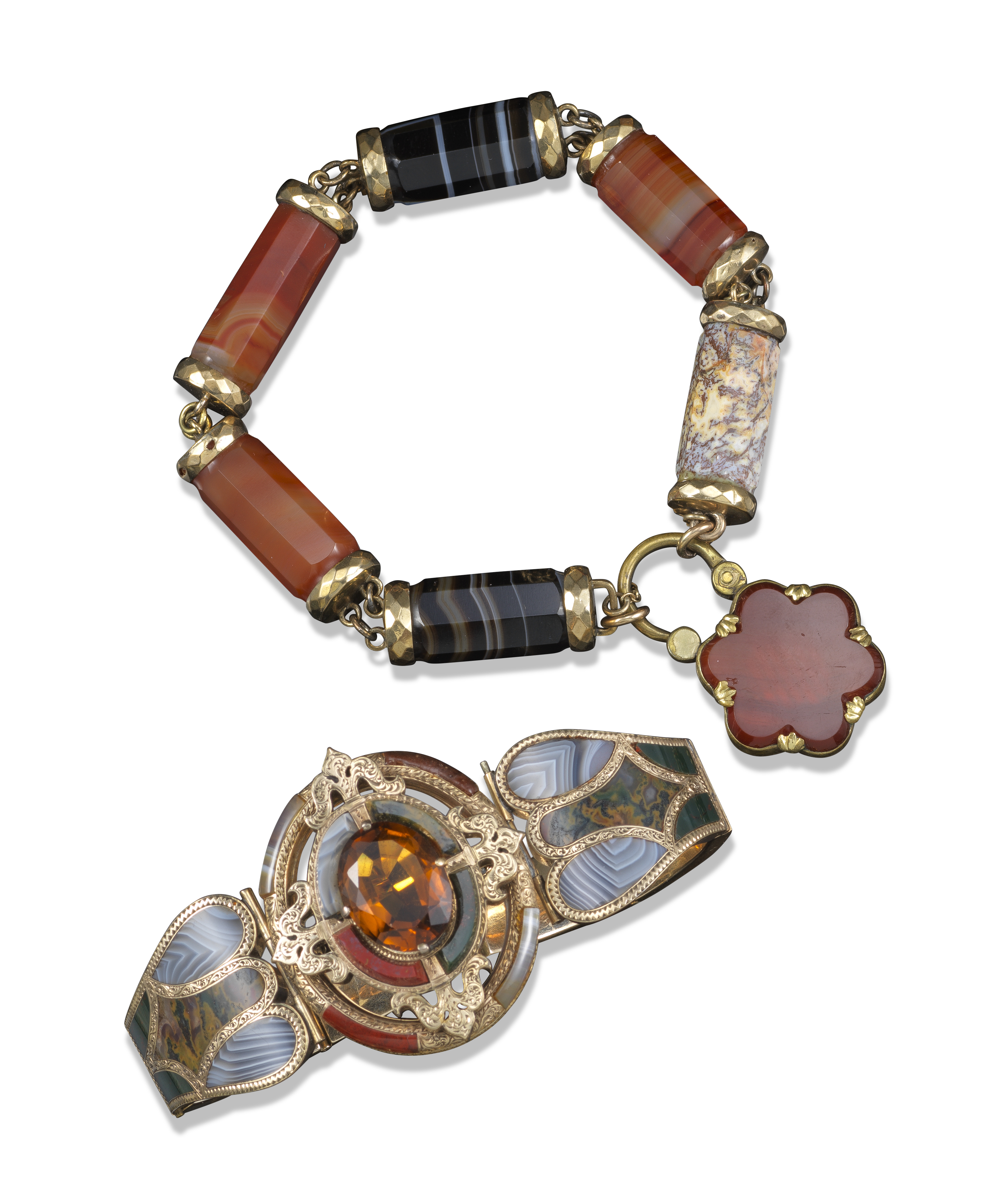 Two Scottish agate-set gold bracelets, one formed from barrel-shaped agate links with gold terminals and a gilded locket clasp set with plated hair, 18cm long, the other set with a central oval-shaped citrine within an agate border, on a gold bracelet set with agates within gold scroll border, 18cm long