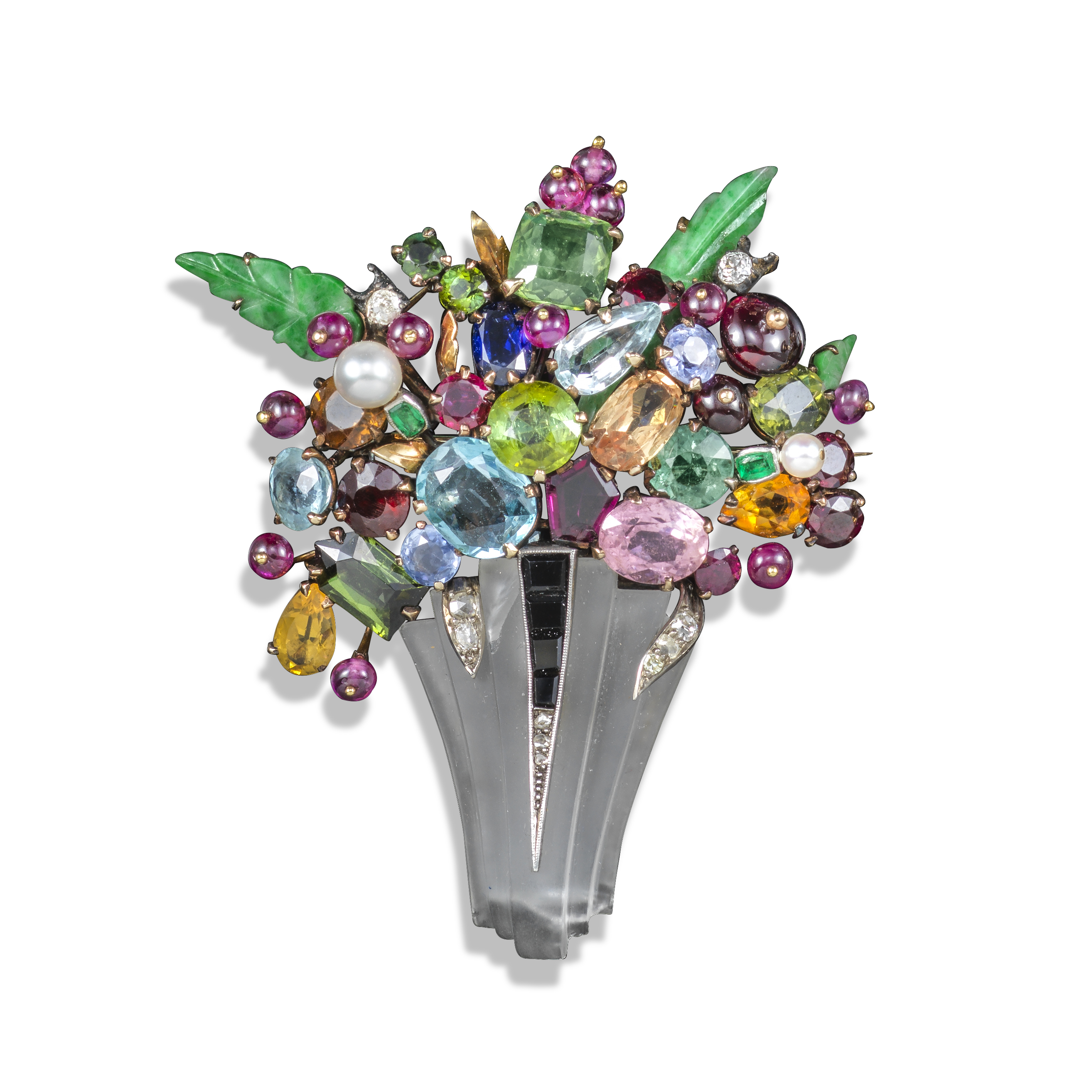 A multi gem-set giardinetto brooch, set with various gemstones including peridot, aquamarines, ruby beads and jade leaves, the frosted rock crystal vase mounted with a line of graduated black onyx sections and small diamonds, yellow and white gold mounts, 7cm high