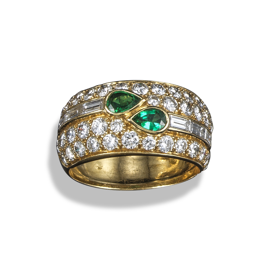 A French emerald and diamond ring, pave-set with circular-cut diamonds with two central lines of baguette-shaped diamonds, each set with emerald terminals, in yellow gold, maker's mark, French control marks, size N 1/2