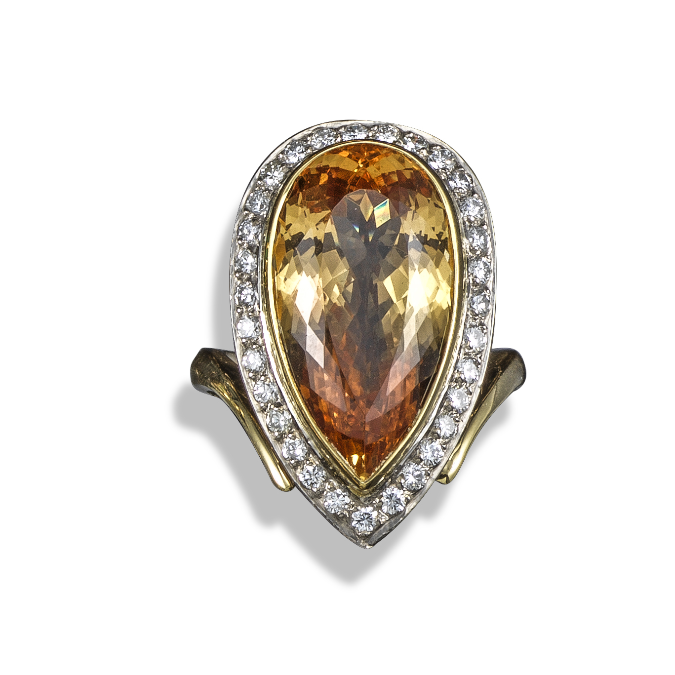 A topaz and diamond cluster ring, the pear-shaped topaz weighs approximately 21.00cts and is set within a surround of thirty-one round brilliant-cut diamonds in platinum and yellow gold, maker's mark CFTM and with London hallmarks for 2016, size O (approx.)
