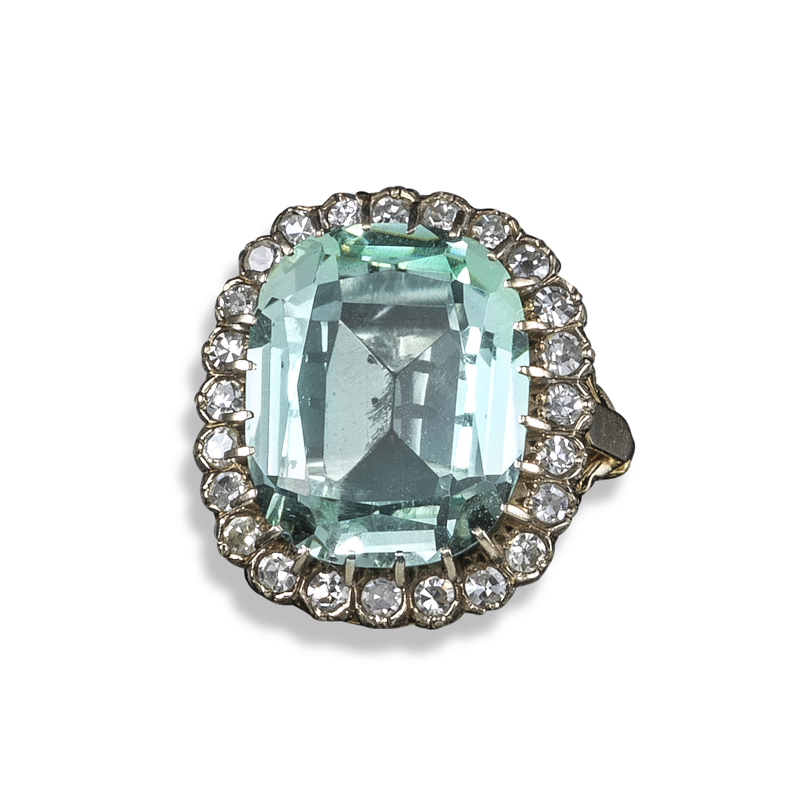 An aquamarine and diamond cluster ring, the cushion-shaped aquamarine weighs approximately 11.00cts and is set within a surround of circular-cut diamonds in yellow and white gold, size M