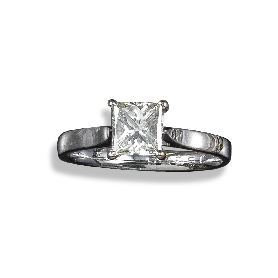 A diamond solitaire ring, the princess-cut diamond weighs 1.00cts and set in white gold, size N 1/2