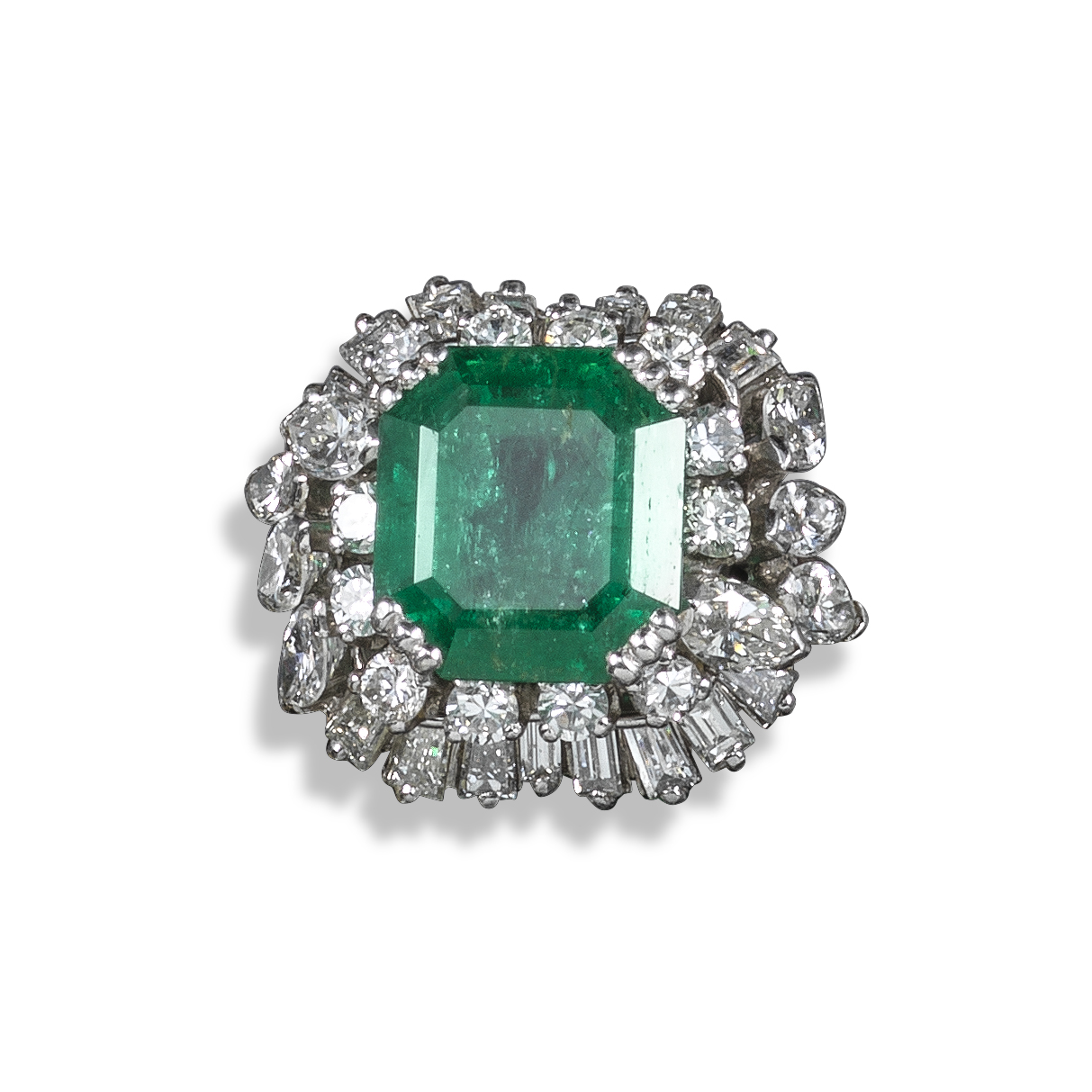 An emerald and diamond cluster ring by Hammerman Bros., the emerald-cut emerald weighs approximately 6.90cts and is set within a foliate surround of circular-cut, marquise and tapered baguette-shaped diamonds in white gold, size M