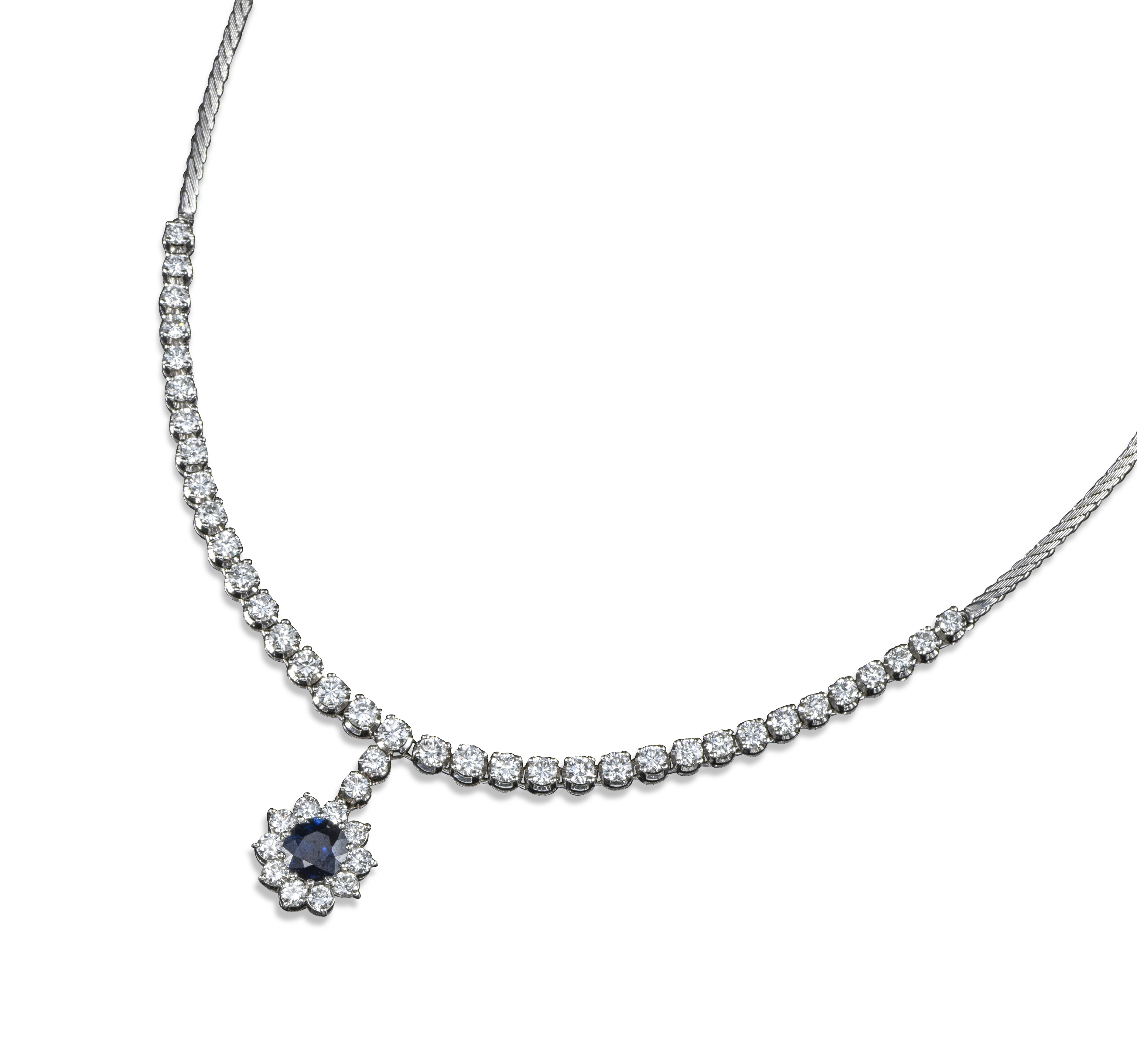 A sapphire and diamond necklace, the circular-shaped sapphire set within a surround of ten round brilliant-cut diamonds, suspending from a link of round brilliant-cut diamonds on a white-gold neck chain part-set with graduated round brilliant-cut diamonds, 44cm long, fitted case by Mappin & Webb
