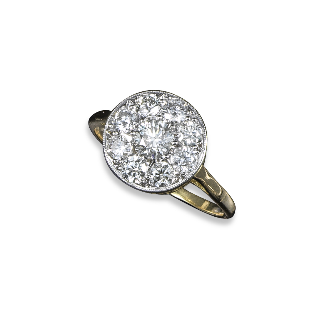 A diamond cluster ring, the centre round brilliant-cut diamond weighs approximately 0.30ts and is pave-set within a surround of eight smaller round brilliant-cut diamonds in white gold, with yellow gold band, size O