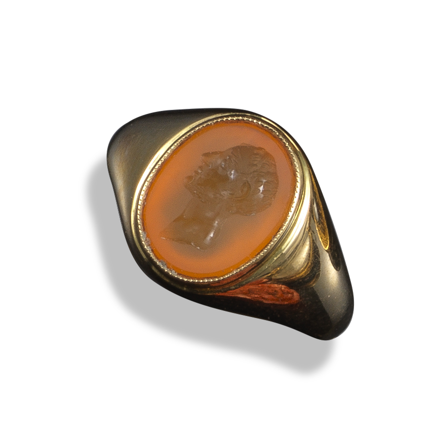 A small carved carnelian intaglio ring, probably 18th century, depicting the profile of a Roman Emperor, later gold mount, size M