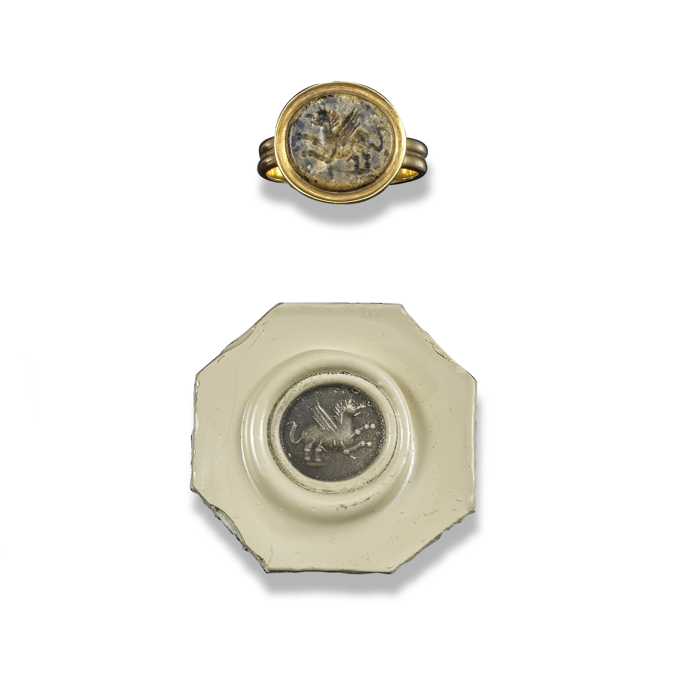 A carved mottled hardstone intaglio, probably Classical, the circular intaglio depicting a rampant griffin, 1.3cm wide, mounted later as a gold ring, size M