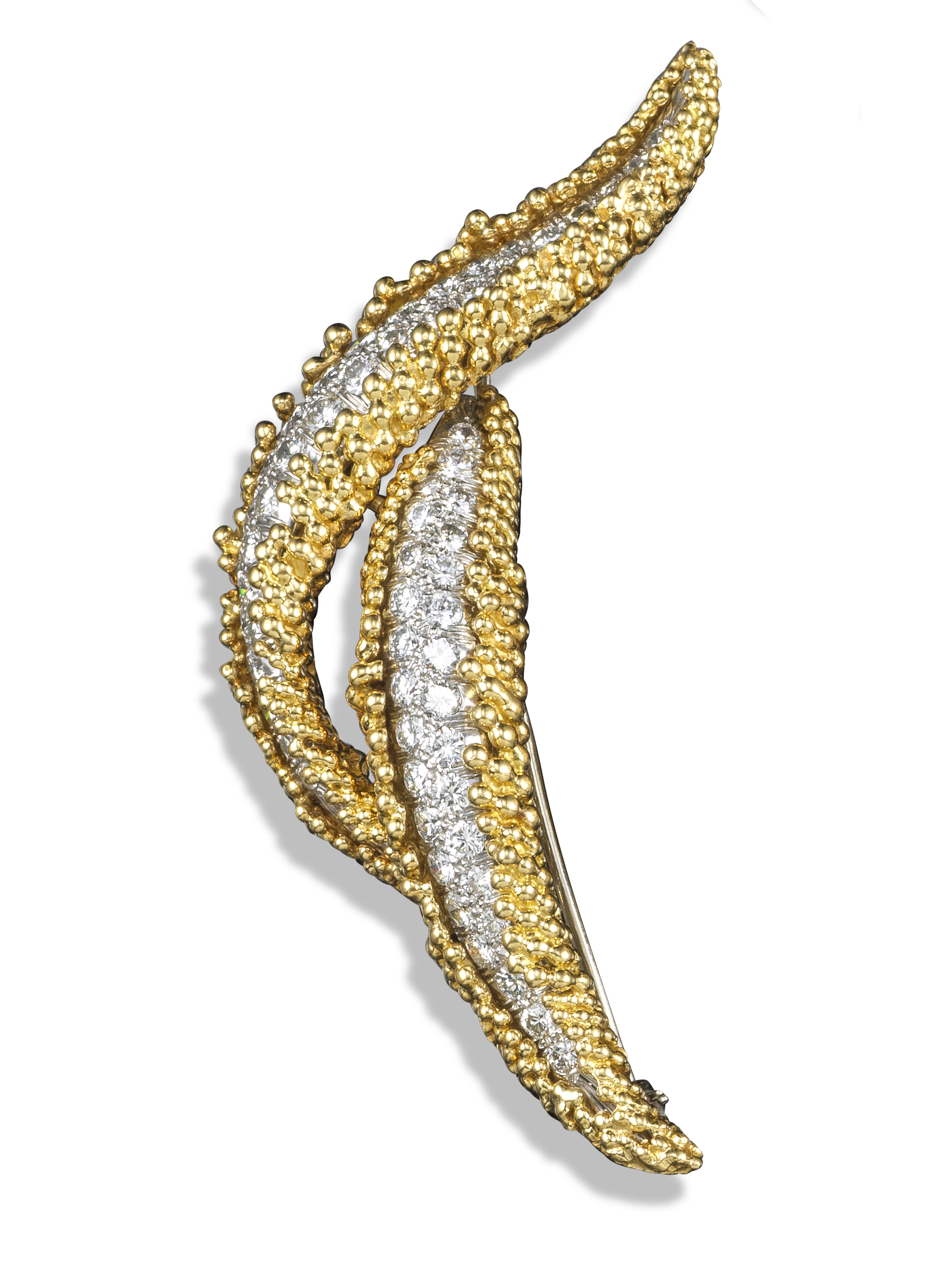 A gold and diamond abstract brooch, designed as two undulating lozenges of graduated circular-cut diamonds within a border of gold pellet decoration in platinum and yellow gold, 7cm long