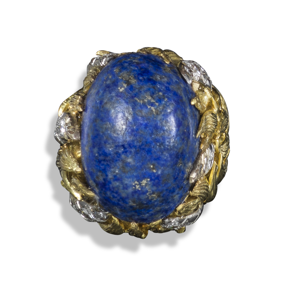 A lapis lazuli and diamond ring by David Webb, of architectural form, the high-domed lapis lazuli cabochon with surrounded with textured and diamond-set pear-shaped sections, joining to create a plaited back section in yellow gold, size M