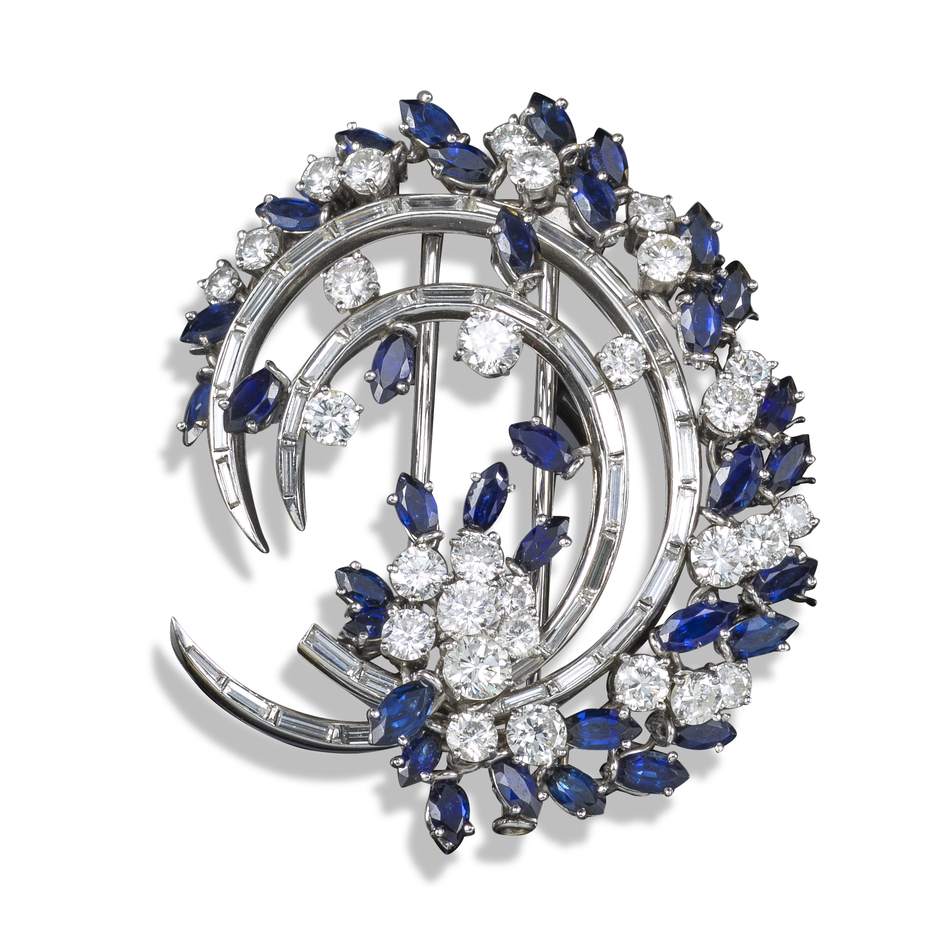 A French diamond and sapphire-set platinum scroll brooch, 1960s, of stylised foliate form with baguette-shaped diamond stems and graduated round brilliant-cut diamond and marquise-shaped sapphire-set leaves, marked 'déposée SSM', 4.5cm wide, Kutchinsky box