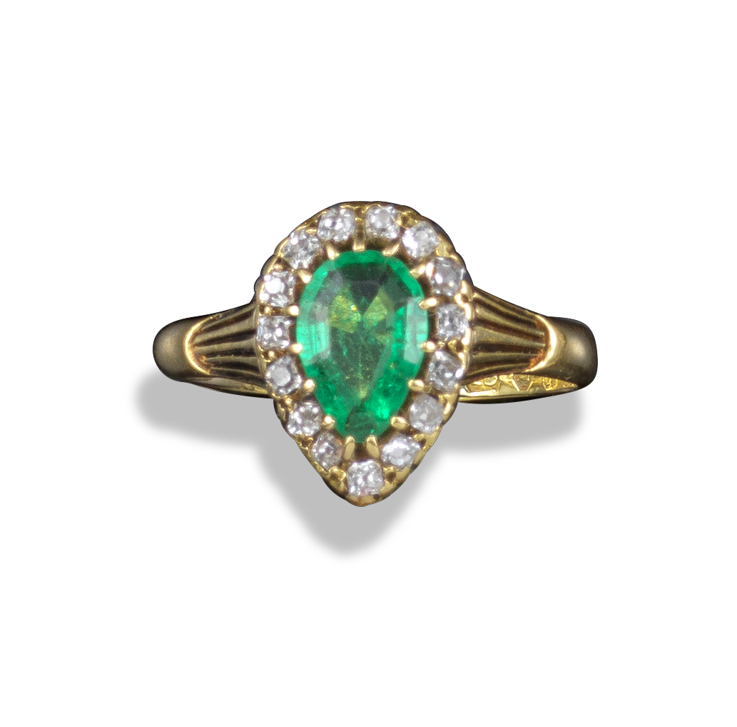 A late 19th century emerald and diamond cluster ring, the pear-shaped emerald is set within a surround of old cushion-shaped diamonds, pierced yellow gold shoulders, London hallmarks for 1888, size Q