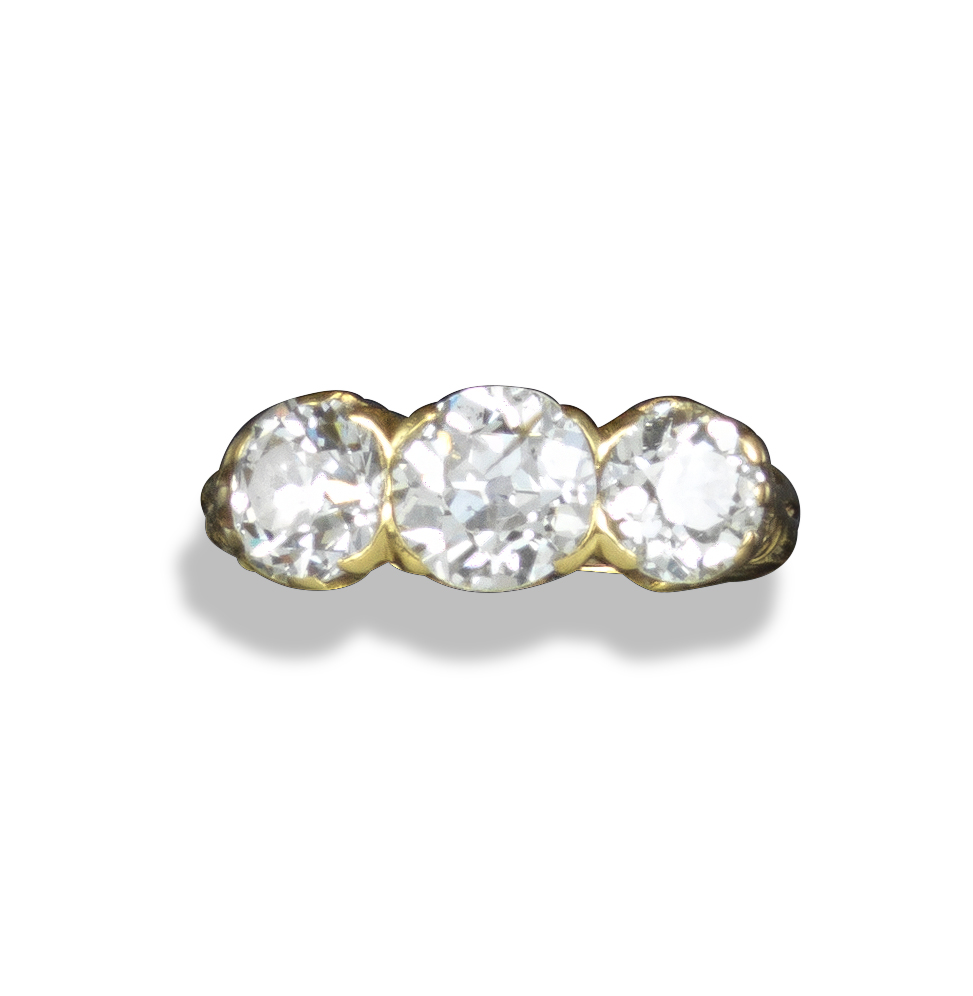 A late 19th century diamond three-stone ring, set with graduated old circular-cut diamonds weighing approximately 2.65cts in total, in carved and pierced yellow gold mount, size J 1/2, case