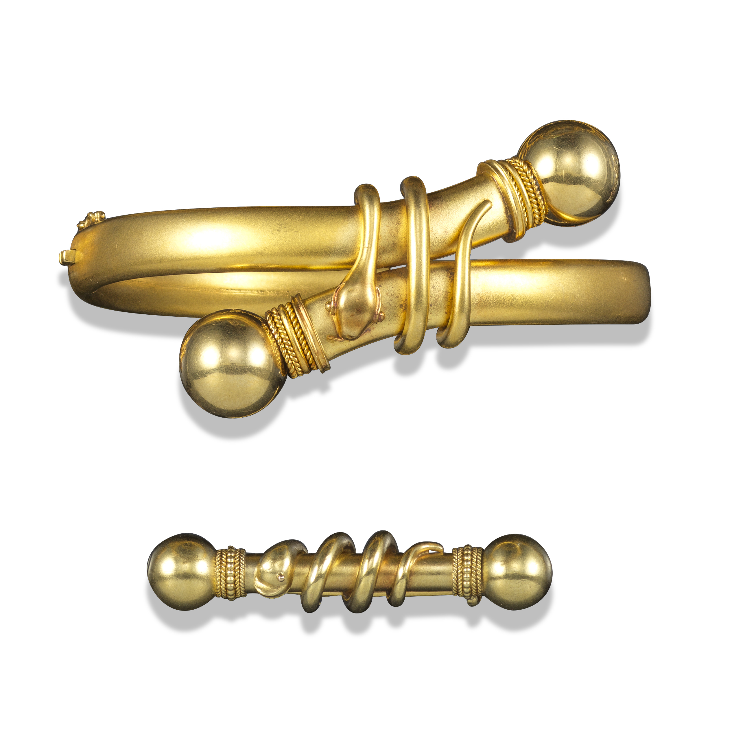 An early 20th century yellow gold serpent bangle and matching bar brooch