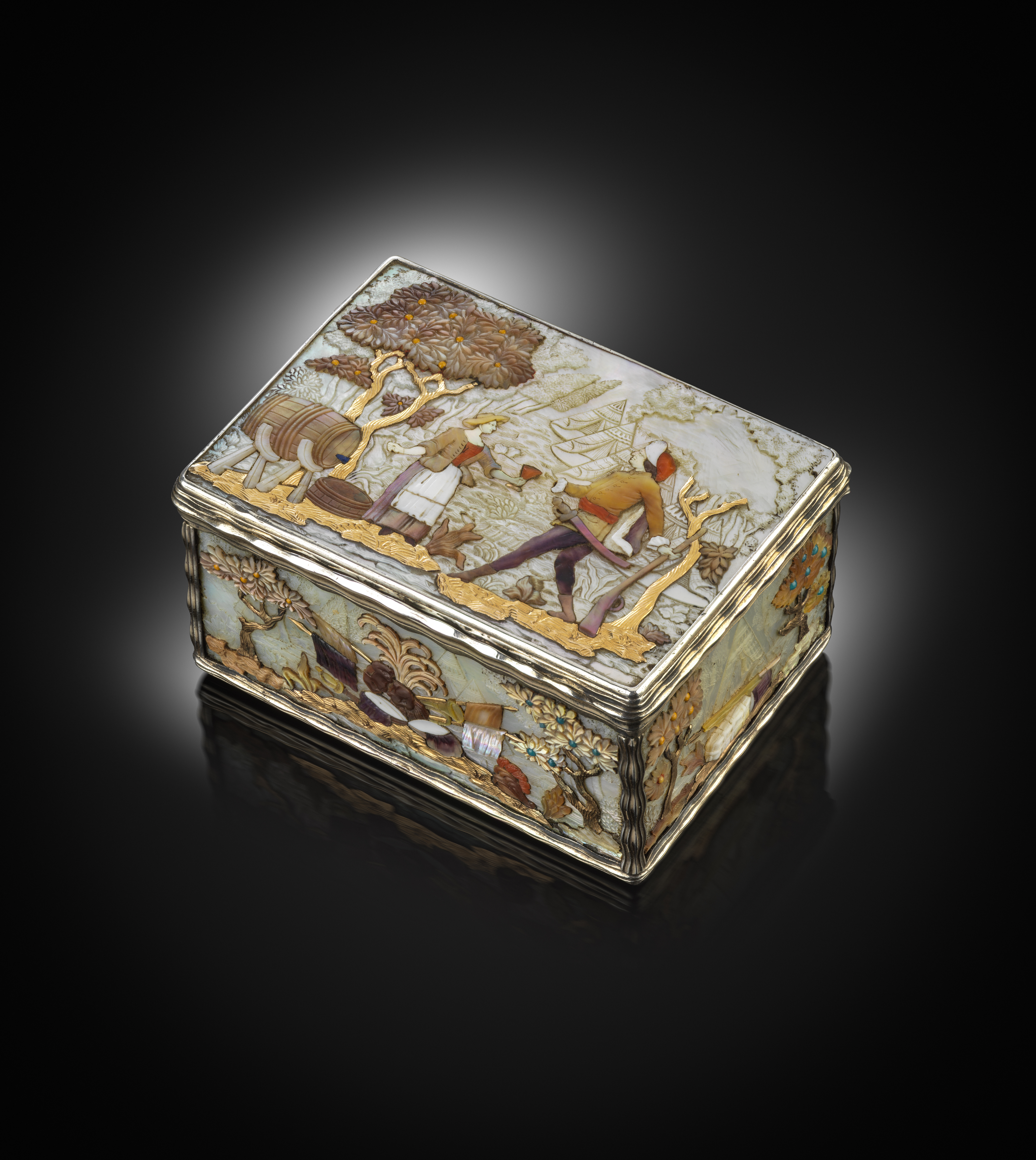 A Louis XV gold, hardstone, shell and silver gilt-mounted snuff box, by Antoine Daroux, Paris 1747, the rectangular box with hinged cover decorated with girl offering a drink from a nearby barrel to a soldier with gun and sword, gold highlights to the ground and tree trunks and all on a carved shell ground, depicting tents, with conforming scenes and decoration to the four sides and base, 8cm wide, the cover and internal base with the mark of Antoine Daroux, the silver borders with wavy decoration