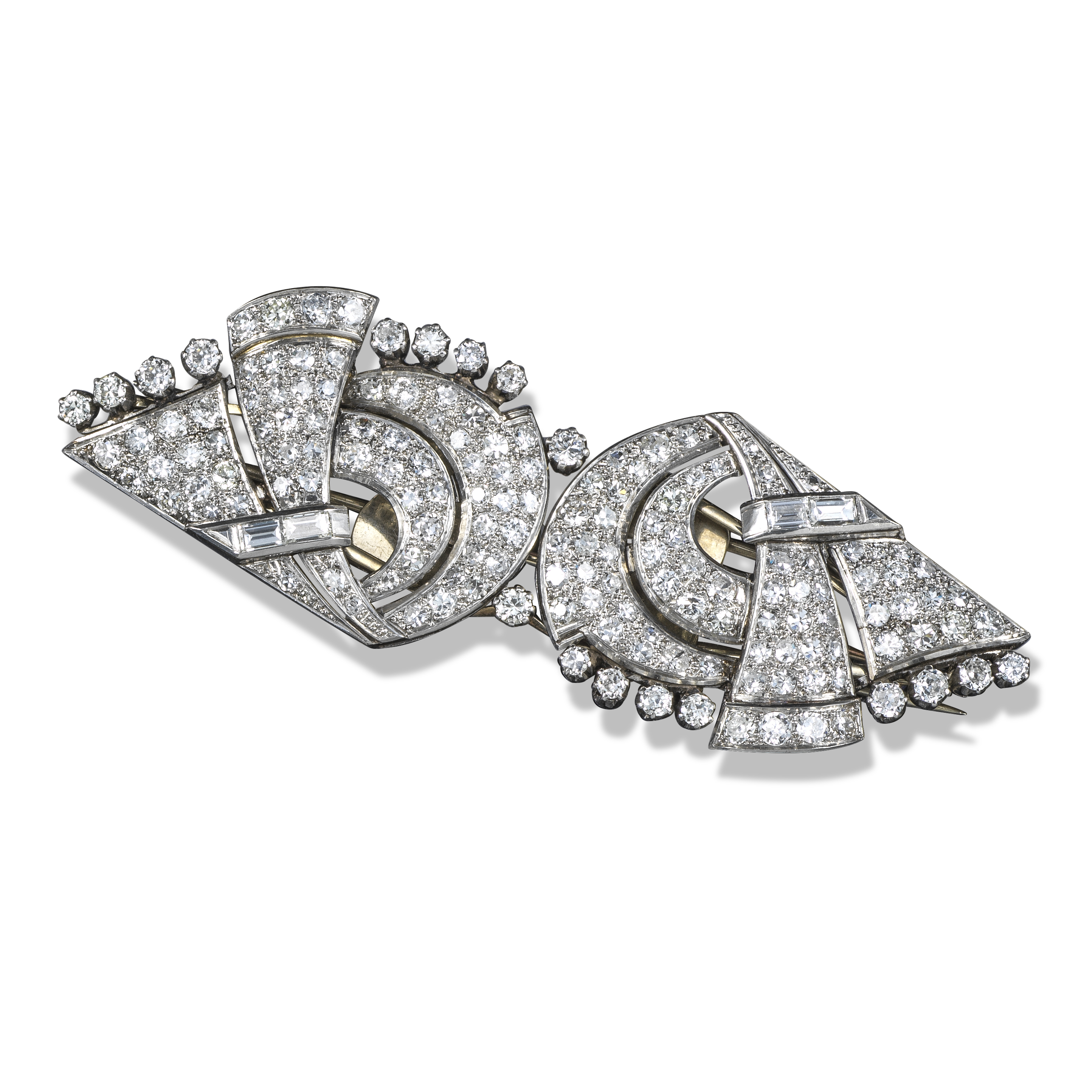 An Art Deco diamond-set double clip brooch, of scroll design and set overall with graduated single-cuts, circular-cuts and baguette-shaped diamonds in platinum and yellow gold, 9cm long