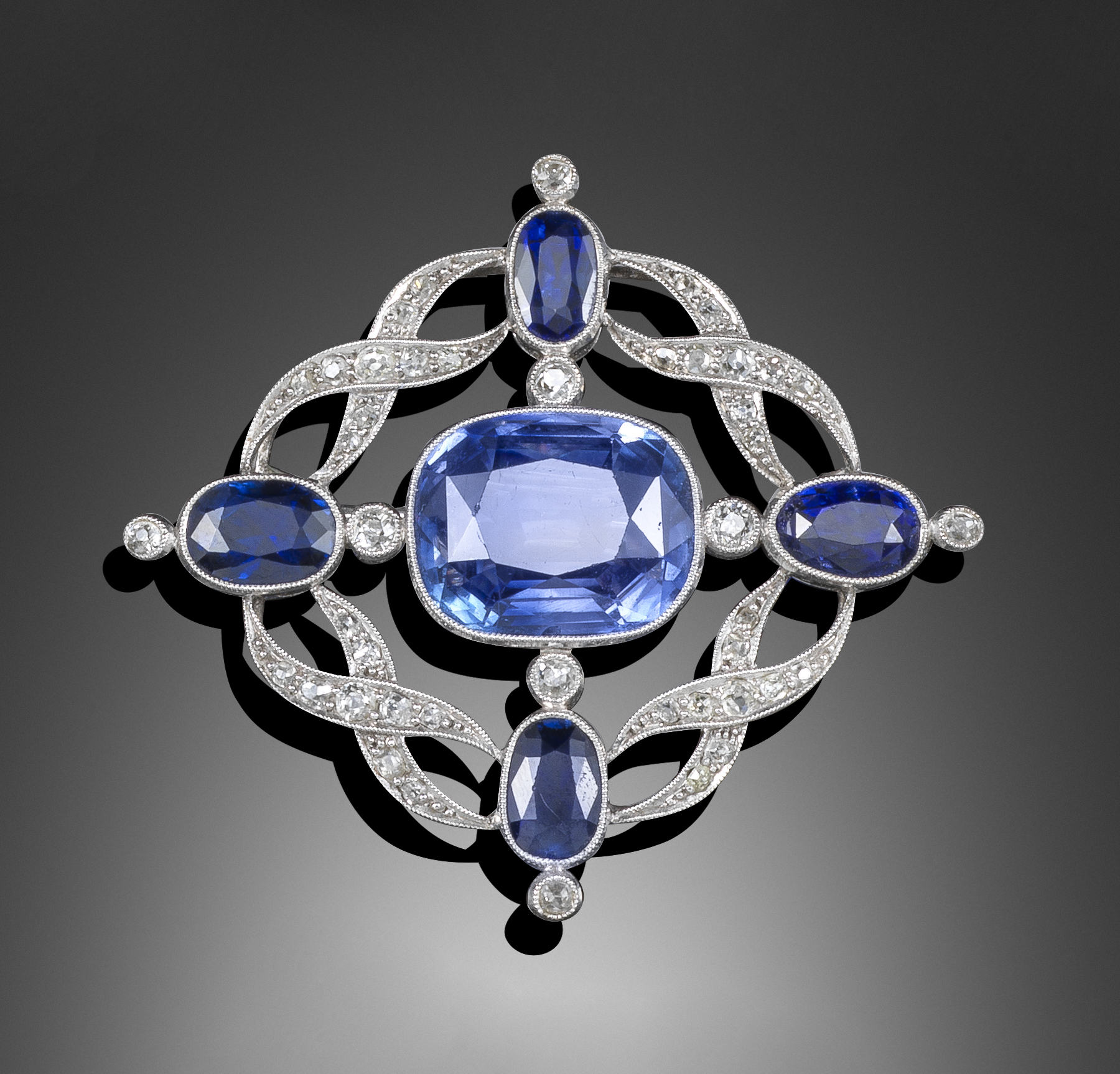 An Edwardian sapphire and diamond brooch, set with a central cushion-shaped sapphire within twisted diamond laurel surround, quartered with oval-shaped sapphires with diamond terminals in platinum, 4.5cm wide, fitted case