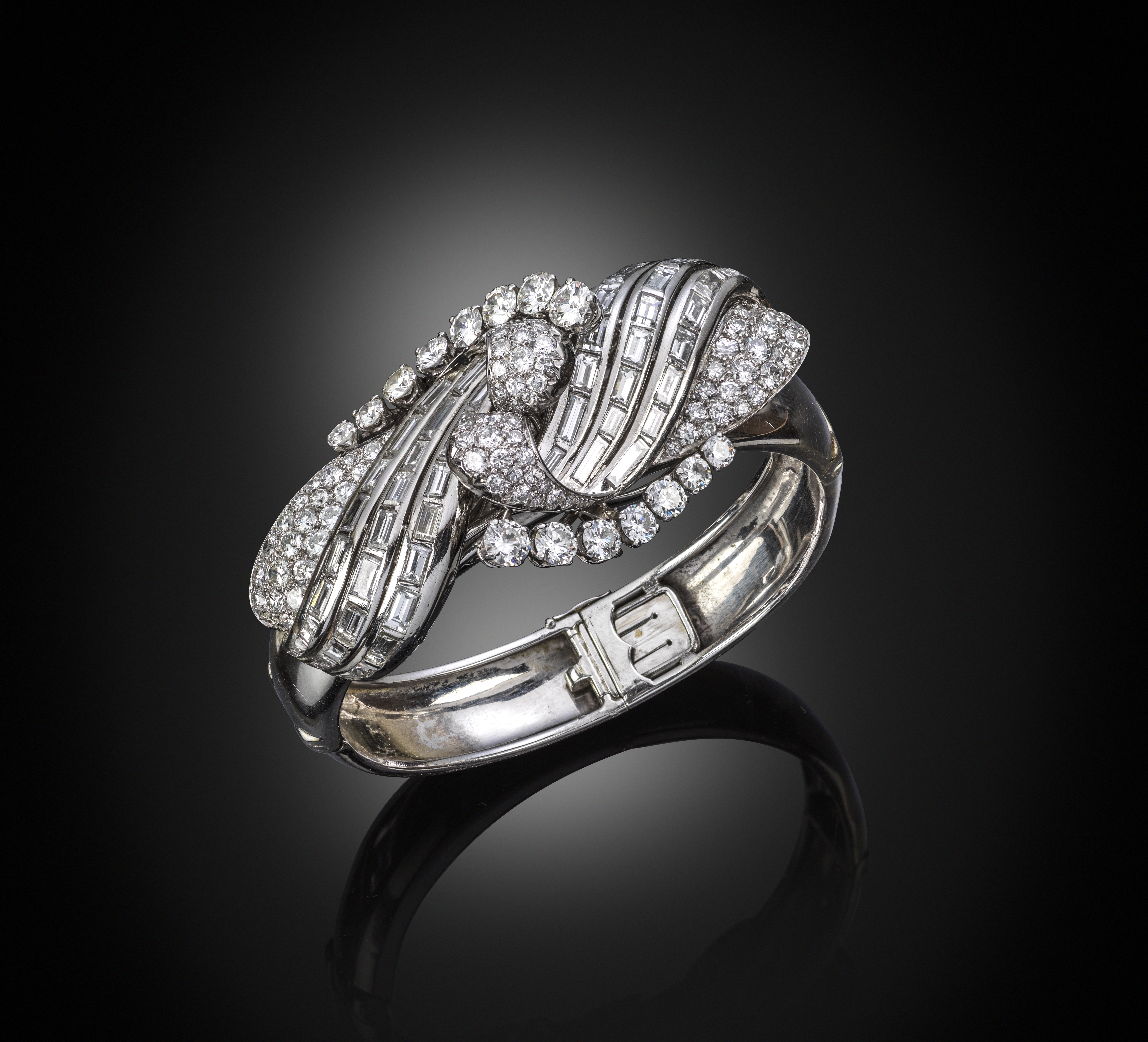 A French diamond hinged bangle, the assymetric raised upper section decorated with scrolling baguette-shaped and graduated circular-cut diamonds pavé-set in platinum, with outer scrolls of circular-cut diamonds in platinum, dividing and separating to be worn as double clips, French control marks and rubbed maker's lozenge, 5.4cm inner diameter, the clips 5cm long