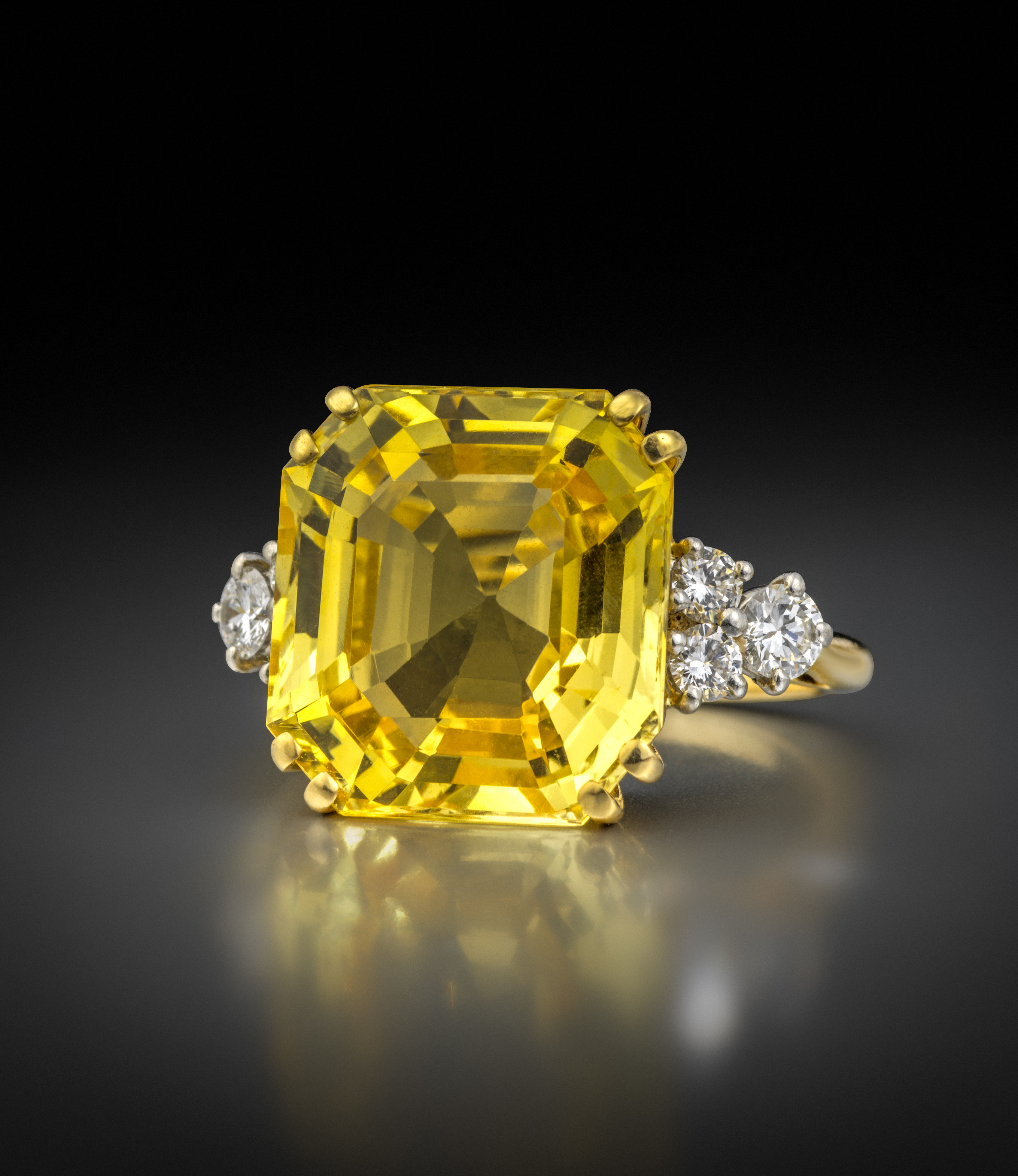 A sapphire and diamond ring by Cartier, the octagonal step-cut yellow sapphire weighs 13.34cts and is set in yellow gold and platinum, signed Cartier, six round brilliant-cut diamonds to each shoulder, size L, Cartier box