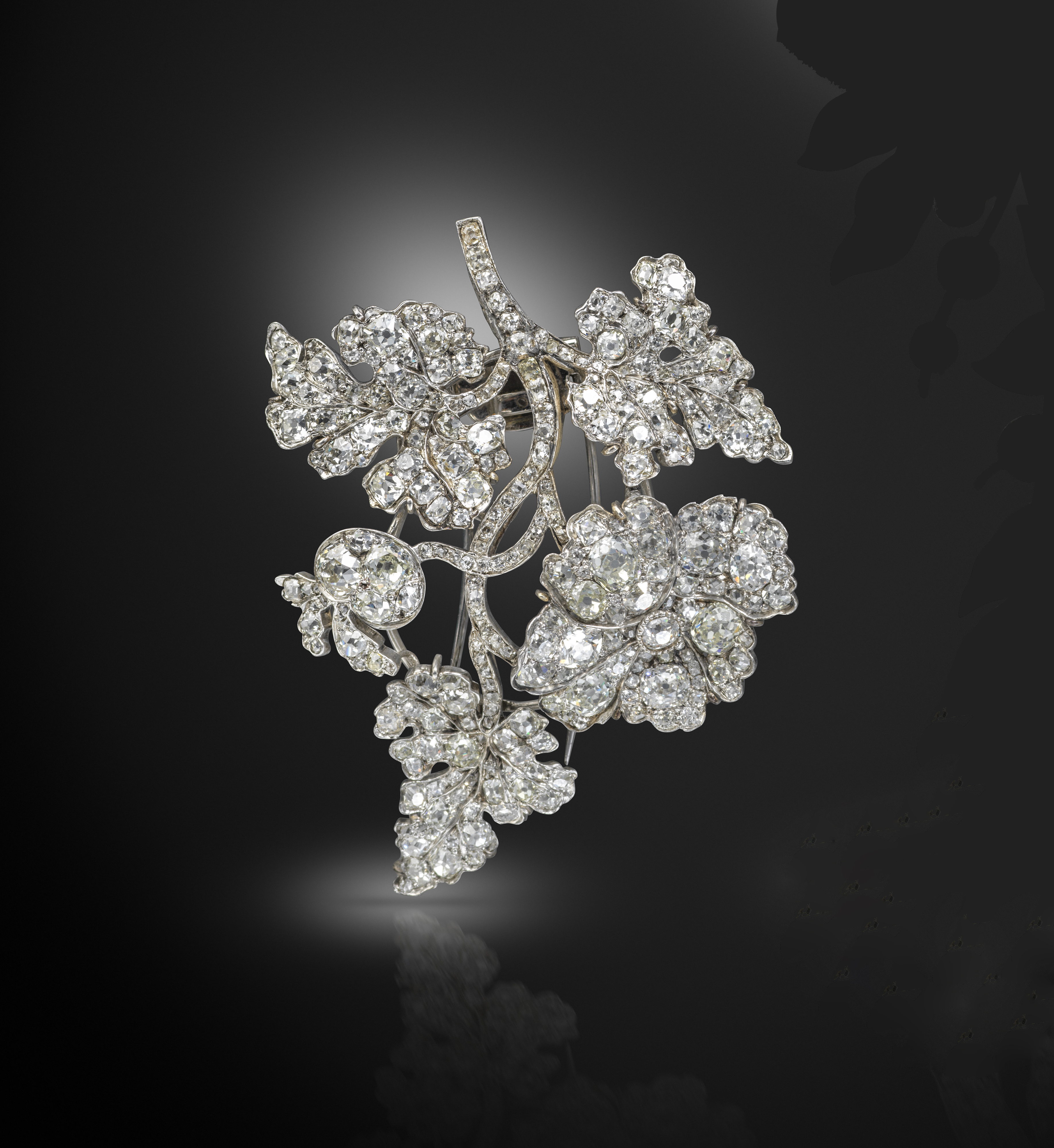 A late 19th century wild rose brooch, realistically formed with a flower, leaves and a rose hip, set overall with graduated old-cut diamonds in silver and gold, 7cm long