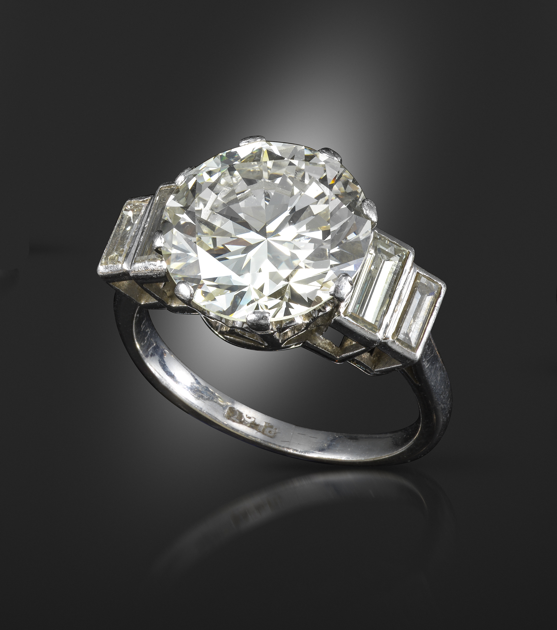 A diamond ring, set with a circular brilliant-cut diamond weighing 5.50cts (known weight), flanked with graduated baguette-shaped diamonds in platinum, size M