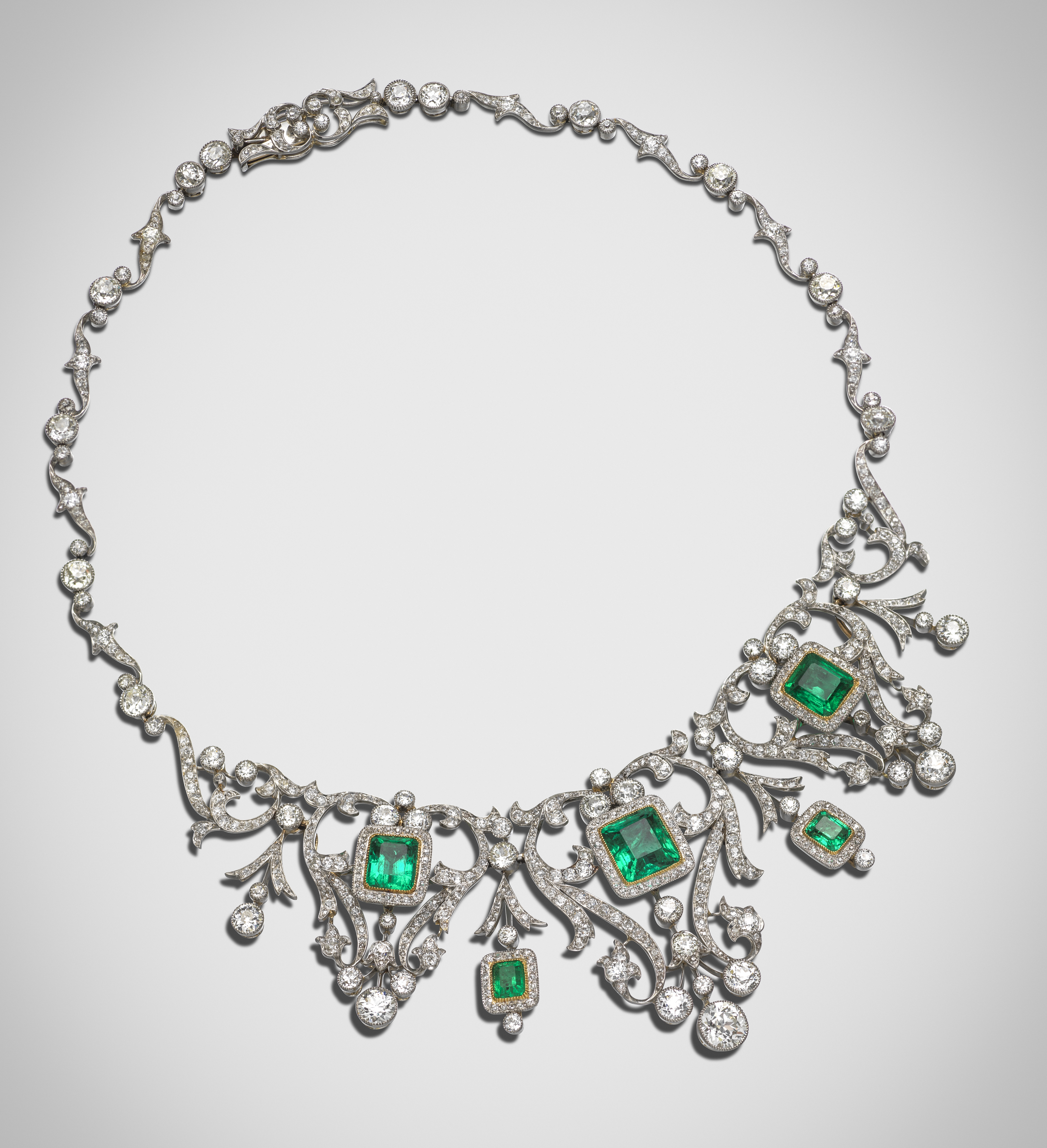 An Edwardian emerald and diamond necklace, converting to a tiara, the three principal rectangular-shaped emeralds are each millegrain-set within a surround of small circular-cut diamonds, in platinum and yellow gold, within open-work Art Nouveau-inspired mounts set with graduated circular-cut diamonds and separated with smaller emerald and diamond drops, the detachable necklace mounted with groups of three graduated circular-cut diamonds and each joined with a diamond-set scroll, with two additional loose scroll links for the necklace, the centre section detaches which allows it to be worn as a tiara (frame missing), necklace 42.5cm (not including spare links), fitted case by Collingwood