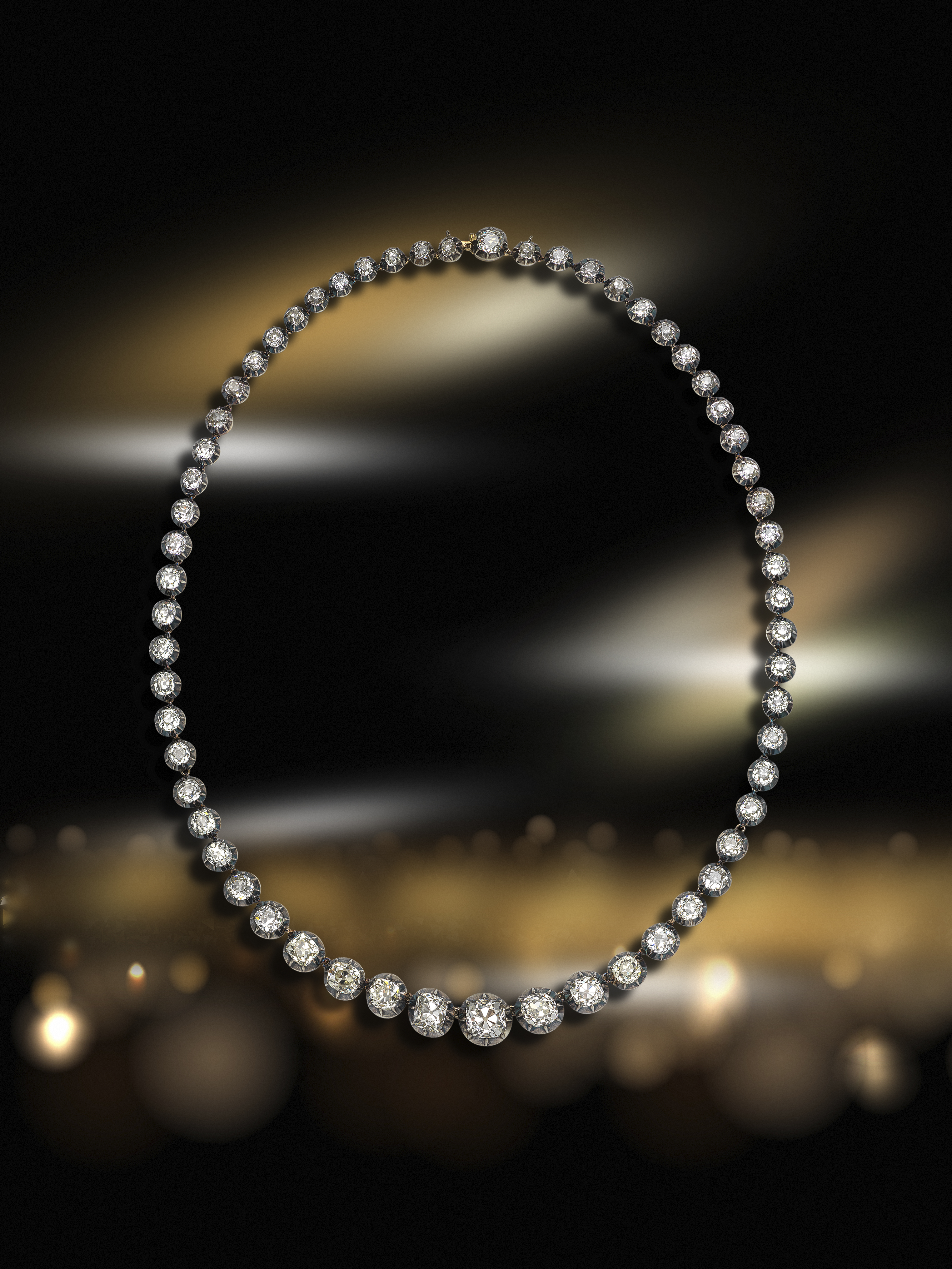 A late Victorian diamond rivière necklace, the graduated cushion-shaped diamonds are set in silver and gold cut-down collets, the nine principal diamonds weigh approximately 19.40cts total, the seven centre principal diamonds detach individually and have separate fittings, 52cm long, fitted case by Collingwood