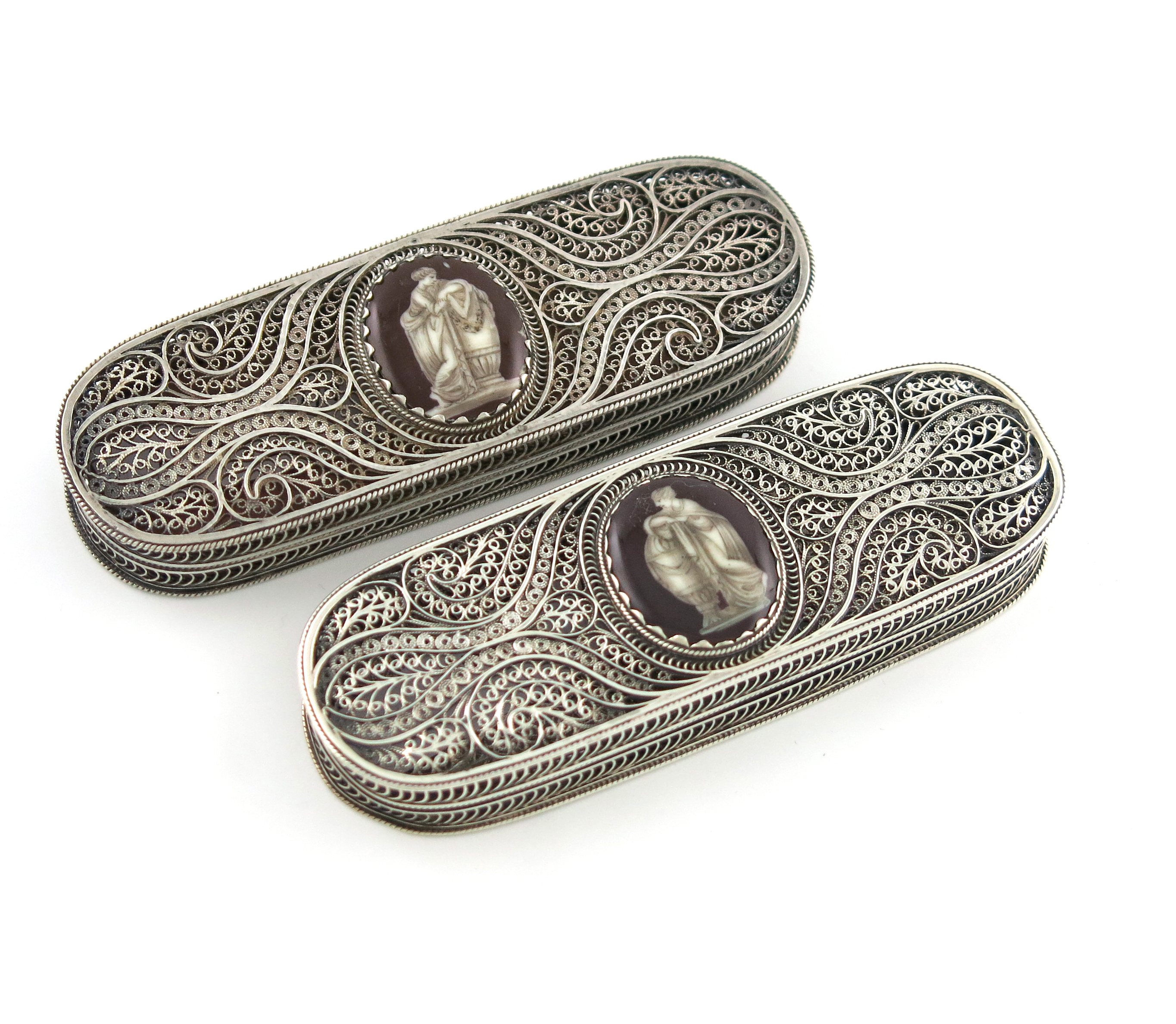 A matched pair of George III silver filigree toothpick boxes