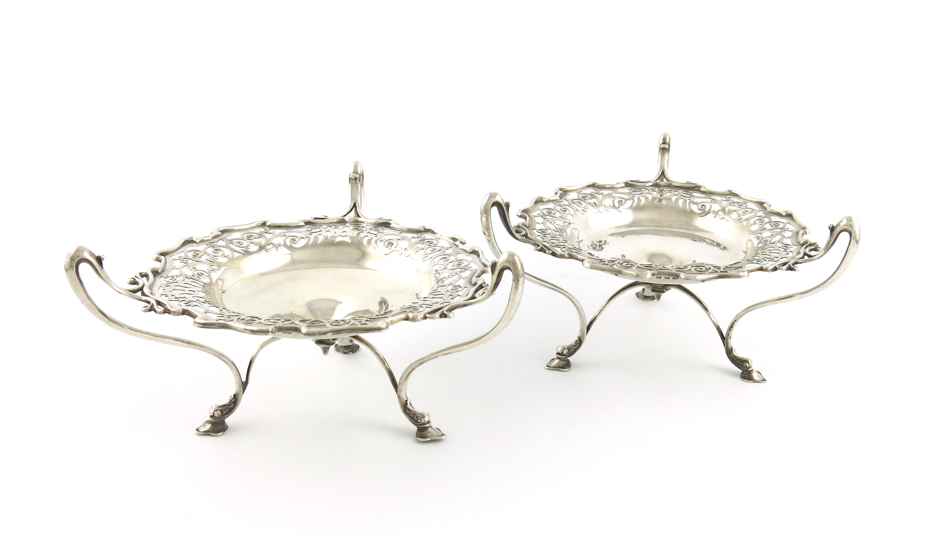 shaped circular form, pierced foliate scroll decoration, bifurcated handles terminating in scroll legs and pad feet, height 11cm, approx. weight 21oz. (2)