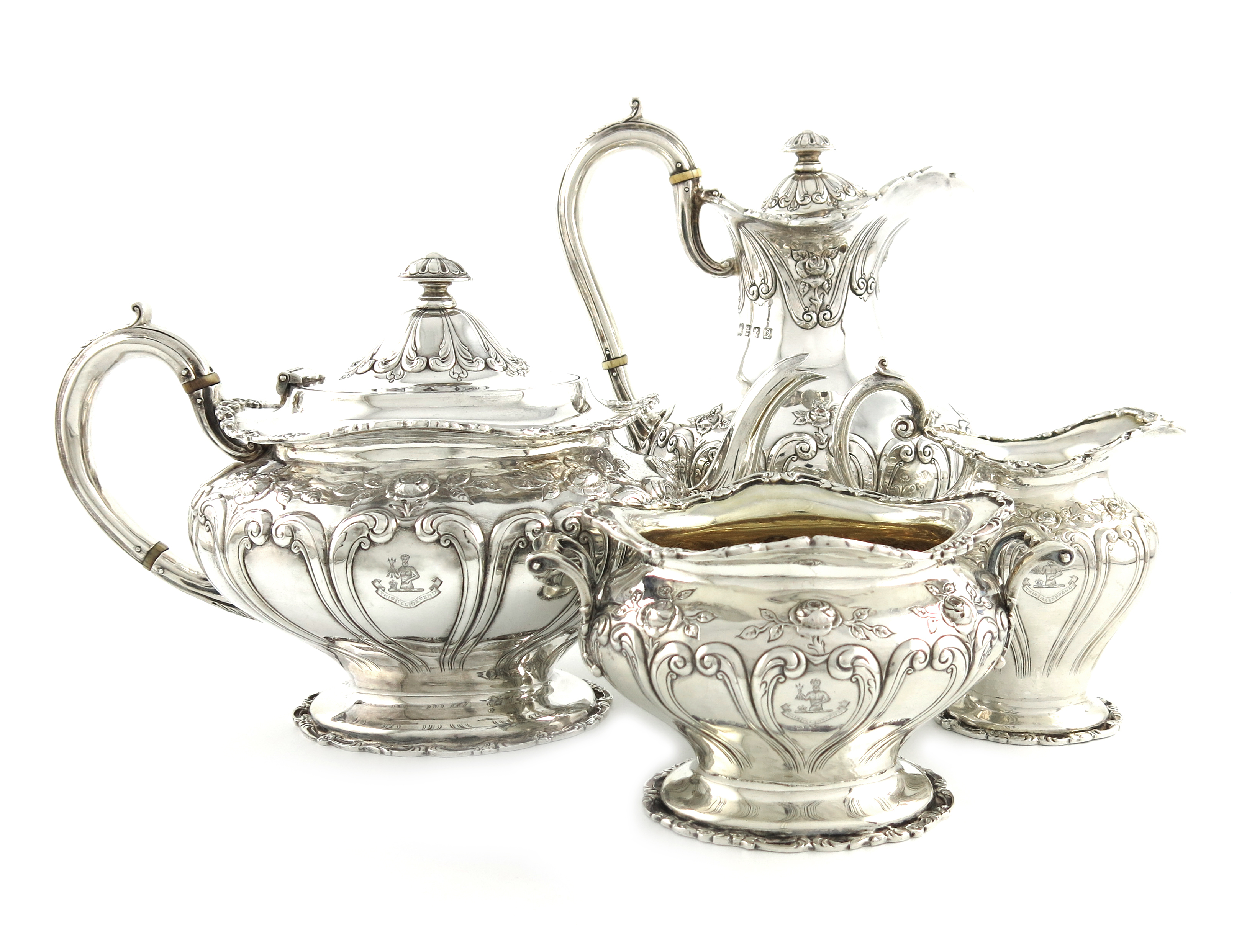 oval bellied form, embossed with roses and foliate scroll decoration, scroll handles with ivory insulators, on oval bases, length handle to spout 28.2cm, approx. weight 63.5oz. (4)