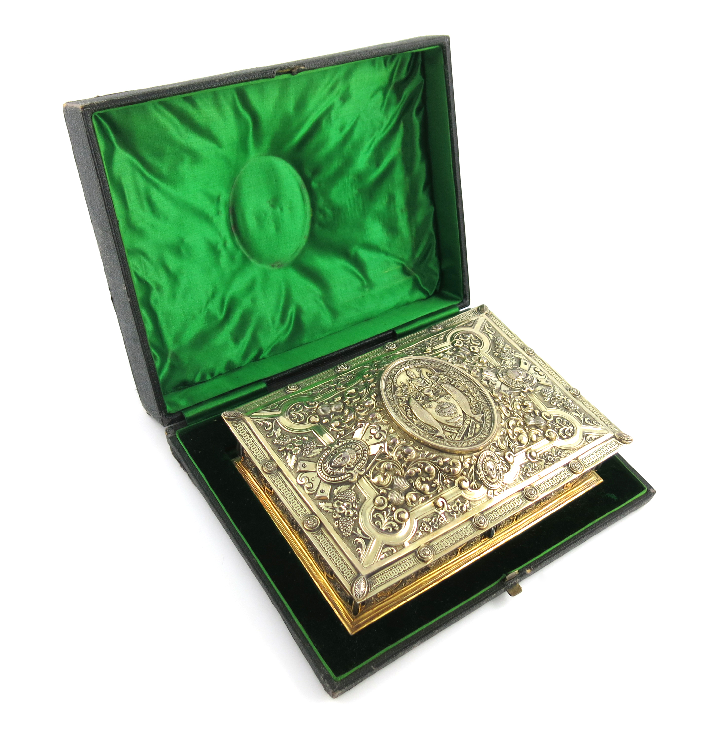 rectangular form, decorated in the Cellini manner, with masks and foliate scroll decoration with thistles, the centre with the arms of Glasgow within an oval cartouche, the interior with a wax seal with the Glasgow arms in a circular silver box and with an illuminated Freedom of the City and Royal Burgh of Glasgow to the Right Honourable Robert Lowe, Chancellor of Her Majesty's Exchequer, in a fitted case, length 20.5cm, approx. weight 32.5oz.