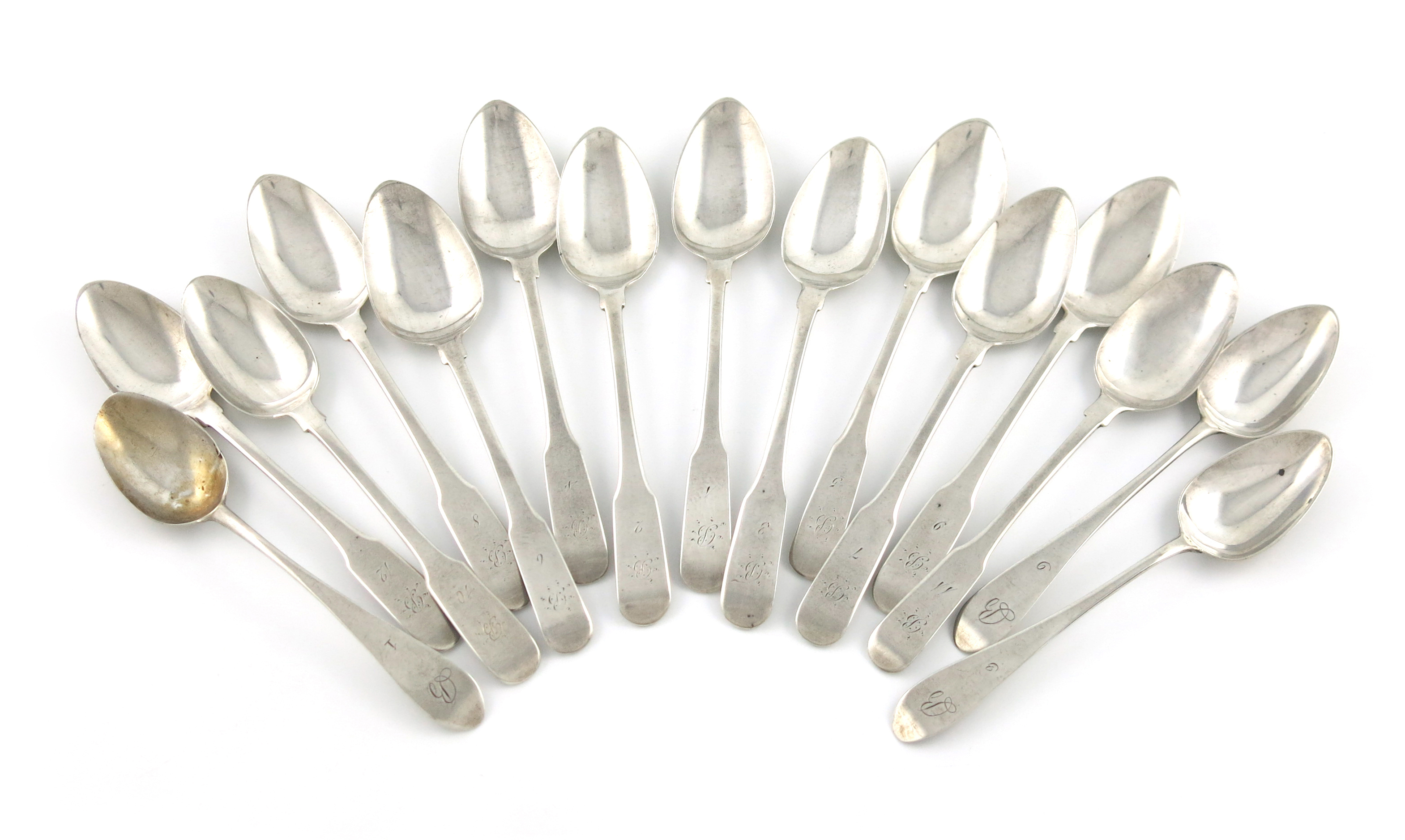 A set of twelve matched George III Scottish provincial and Edwardian silver Fiddle pattern teaspoons